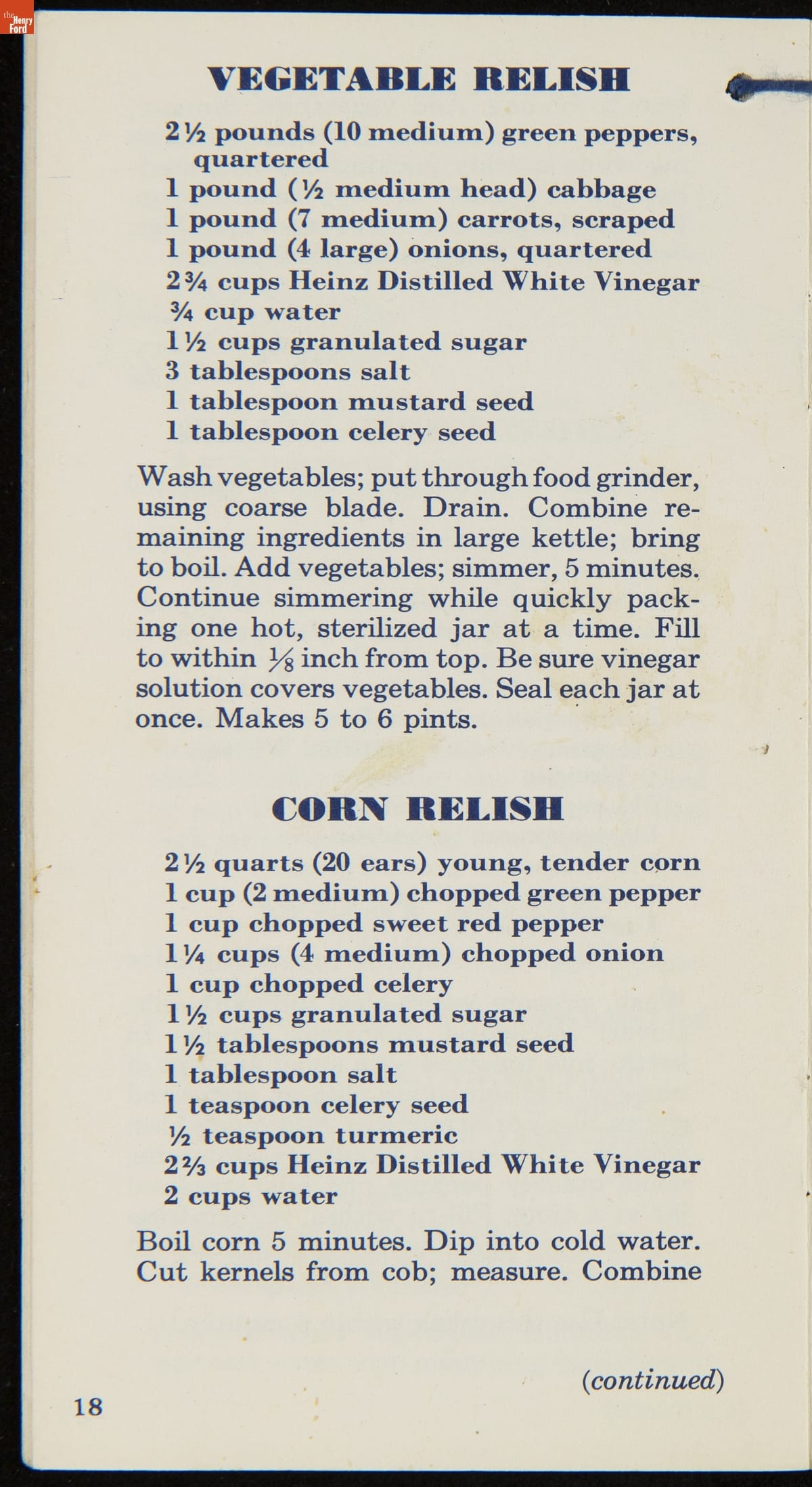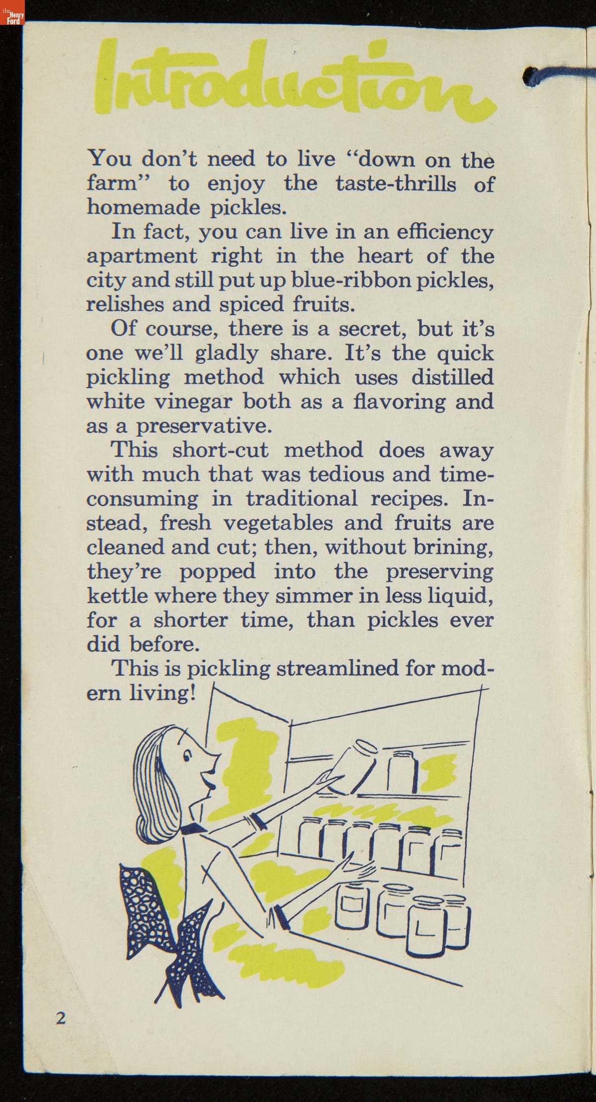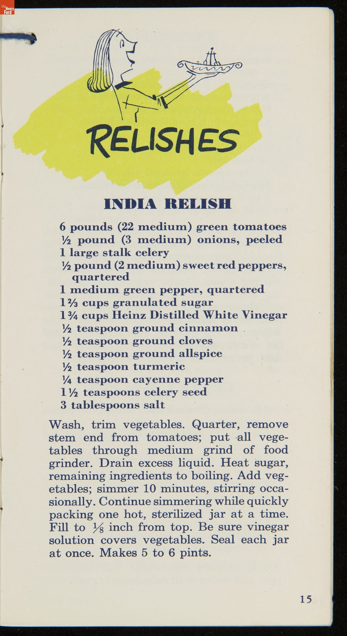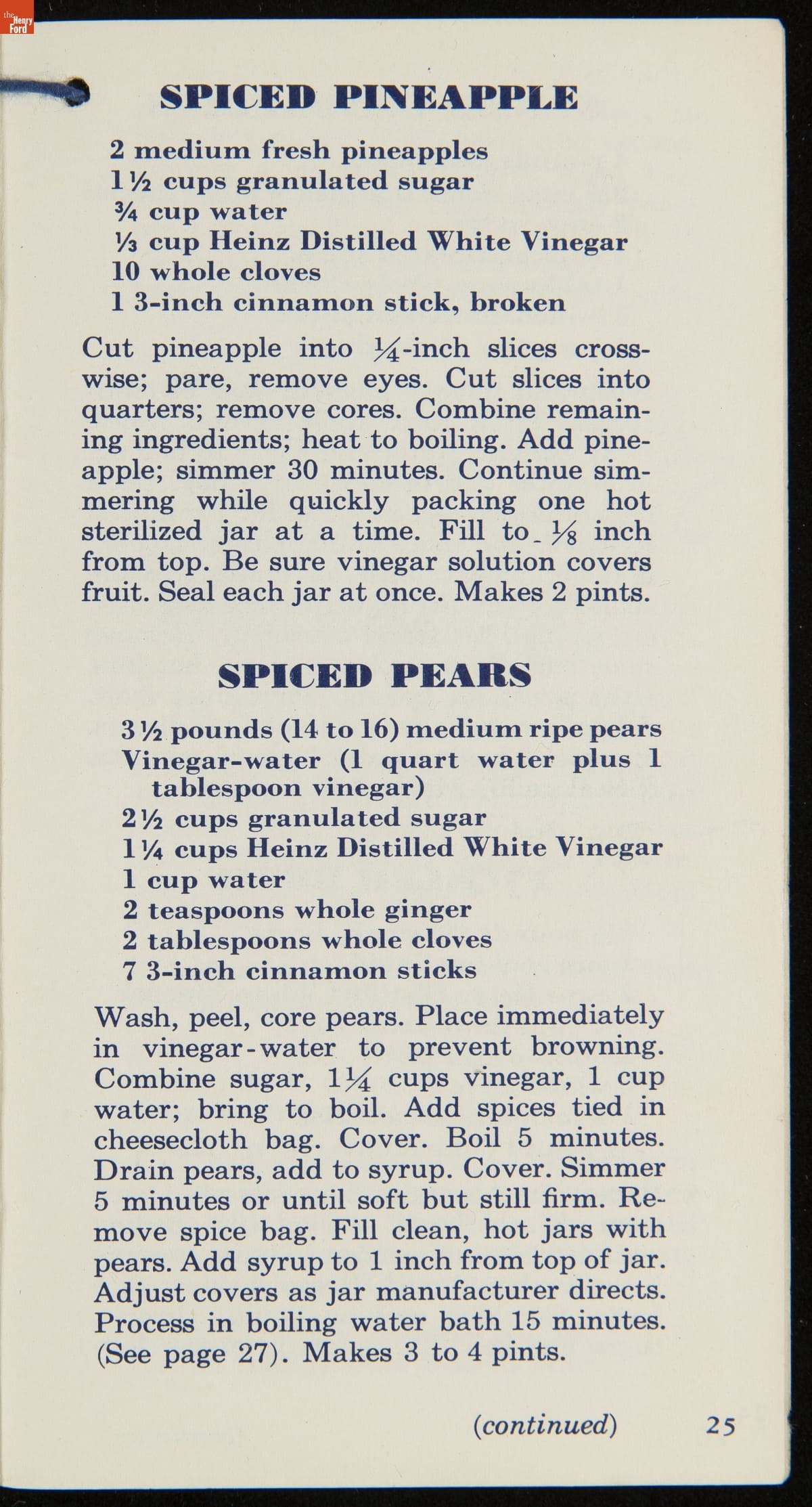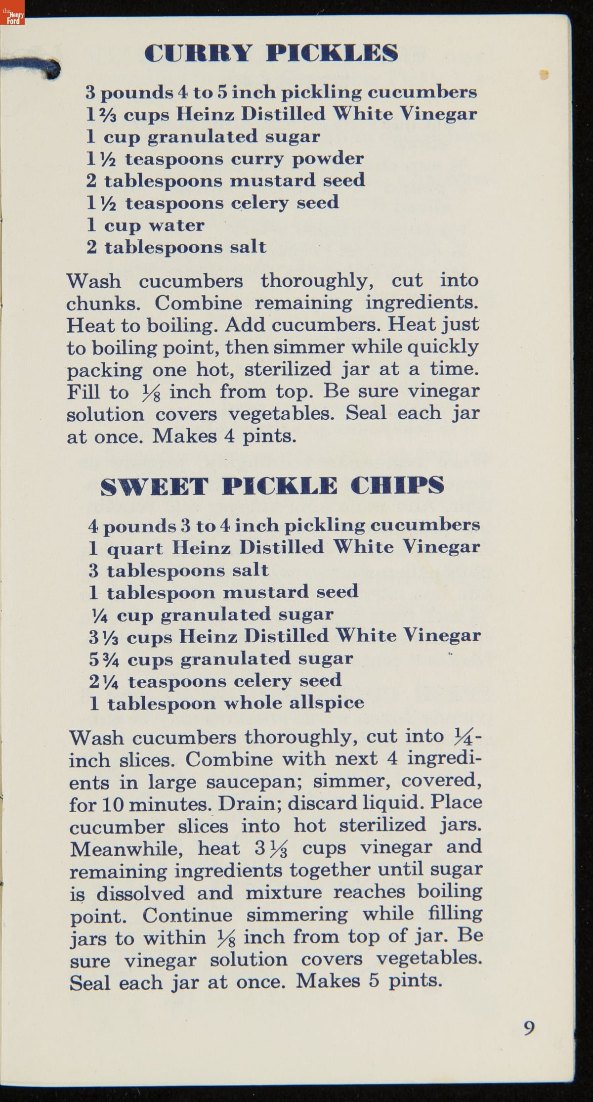 Many manufactured food companies published recipe booklets to promote the use of their products. This booklet published by the H. J. Heinz Company in the 1950s offers homemakers an efficient way to pickle their own products at home. With recipes for making pickles, relishes, and spiced fruits and vegetables, this booklet declares that pickling with Heinz Distilled White Vinegar "is pickling streamlined for modern living!"
