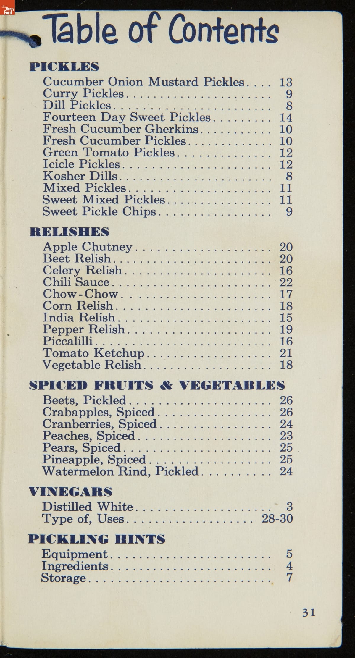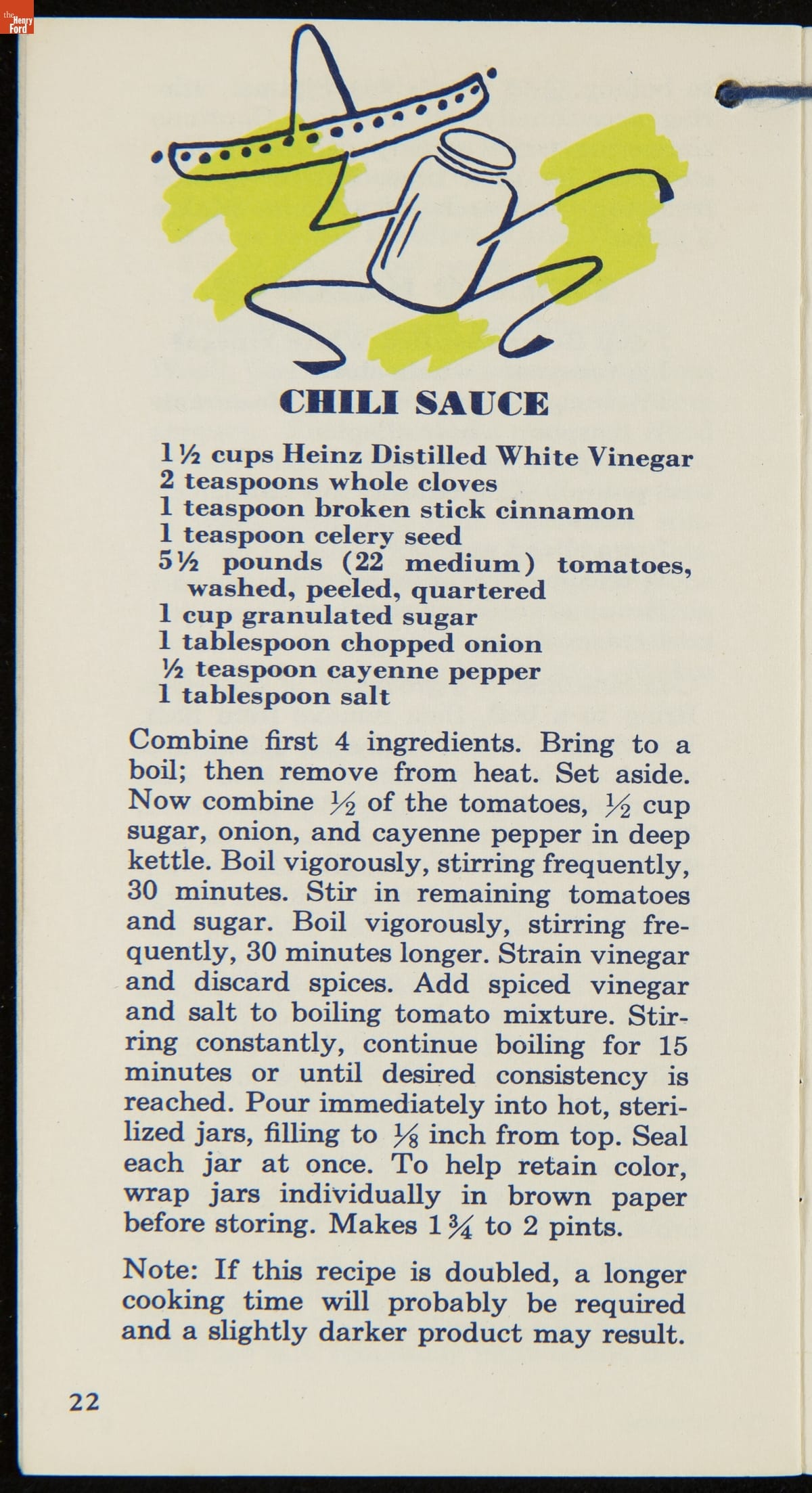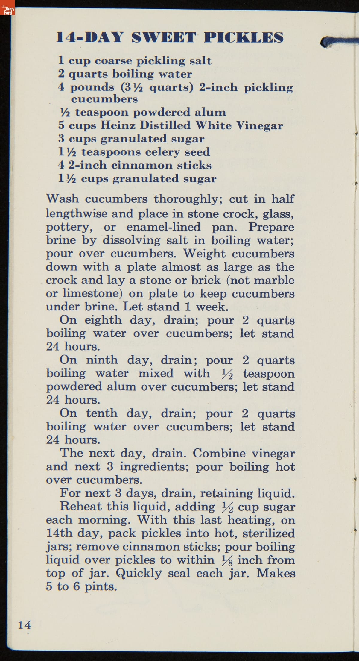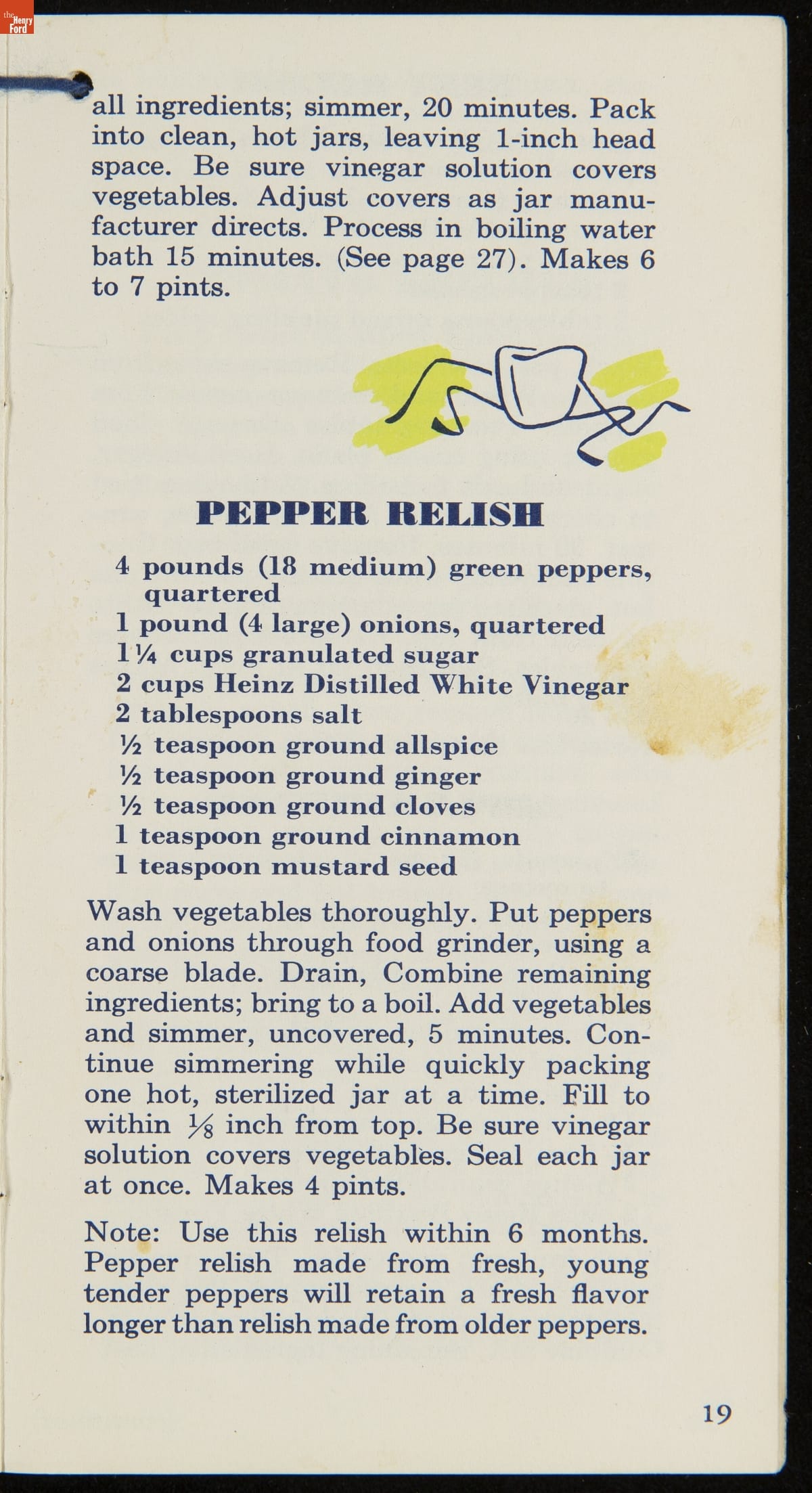 Many manufactured food companies published recipe booklets to promote the use of their products. This booklet published by the H. J. Heinz Company in the 1950s offers homemakers an efficient way to pickle their own products at home. With recipes for making pickles, relishes, and spiced fruits and vegetables, this booklet declares that pickling with Heinz Distilled White Vinegar "is pickling streamlined for modern living!"