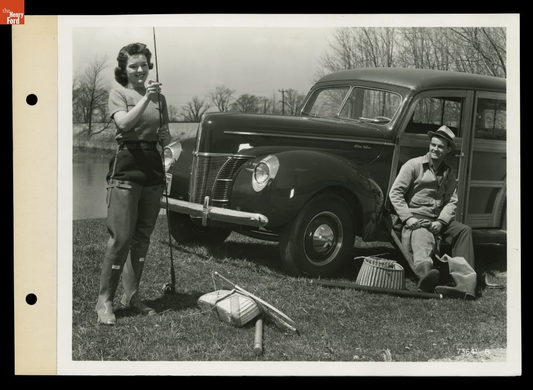 1940 Ford V-8 DeLuxe Station Wagon with People and Fishing Tackle