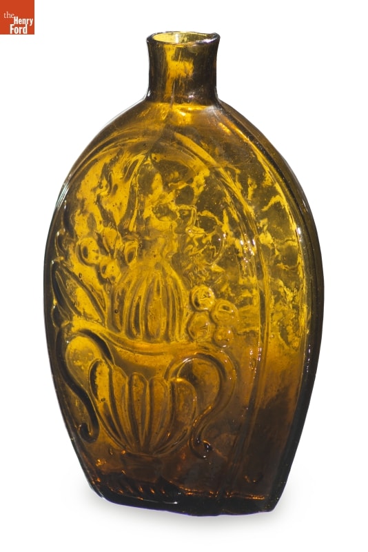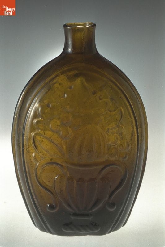 Glass factories in America began producing inexpensive, mold-formed flasks in the early 1800s. These figured flasks, often decorated with symbols of national pride or political or cultural affiliation, appealed to America's common man. The overflowing cornucopia and urn found on either side of this flask alludes to America's agricultural bounty.