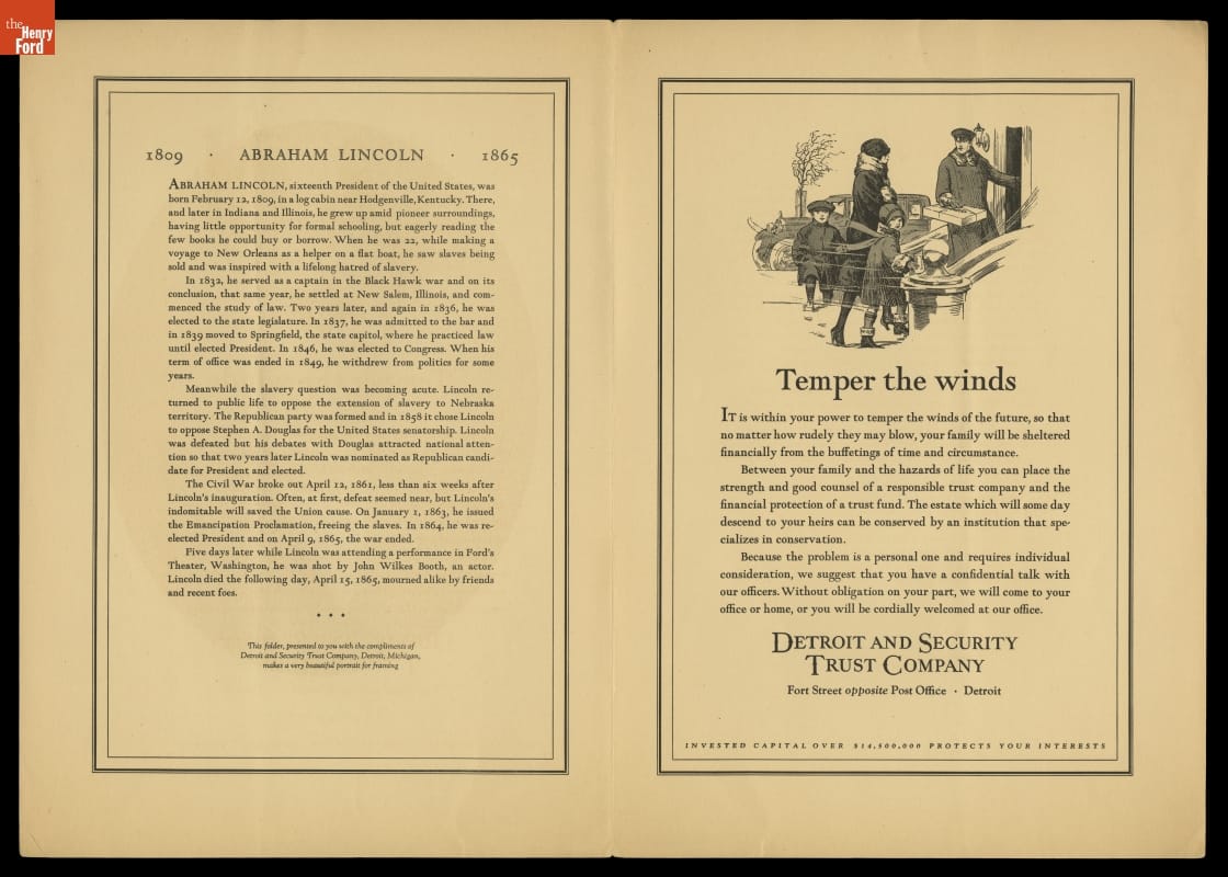 Commemorative Lithograph Portrait of Abraham Lincoln on a 1929 Advertising Brochure