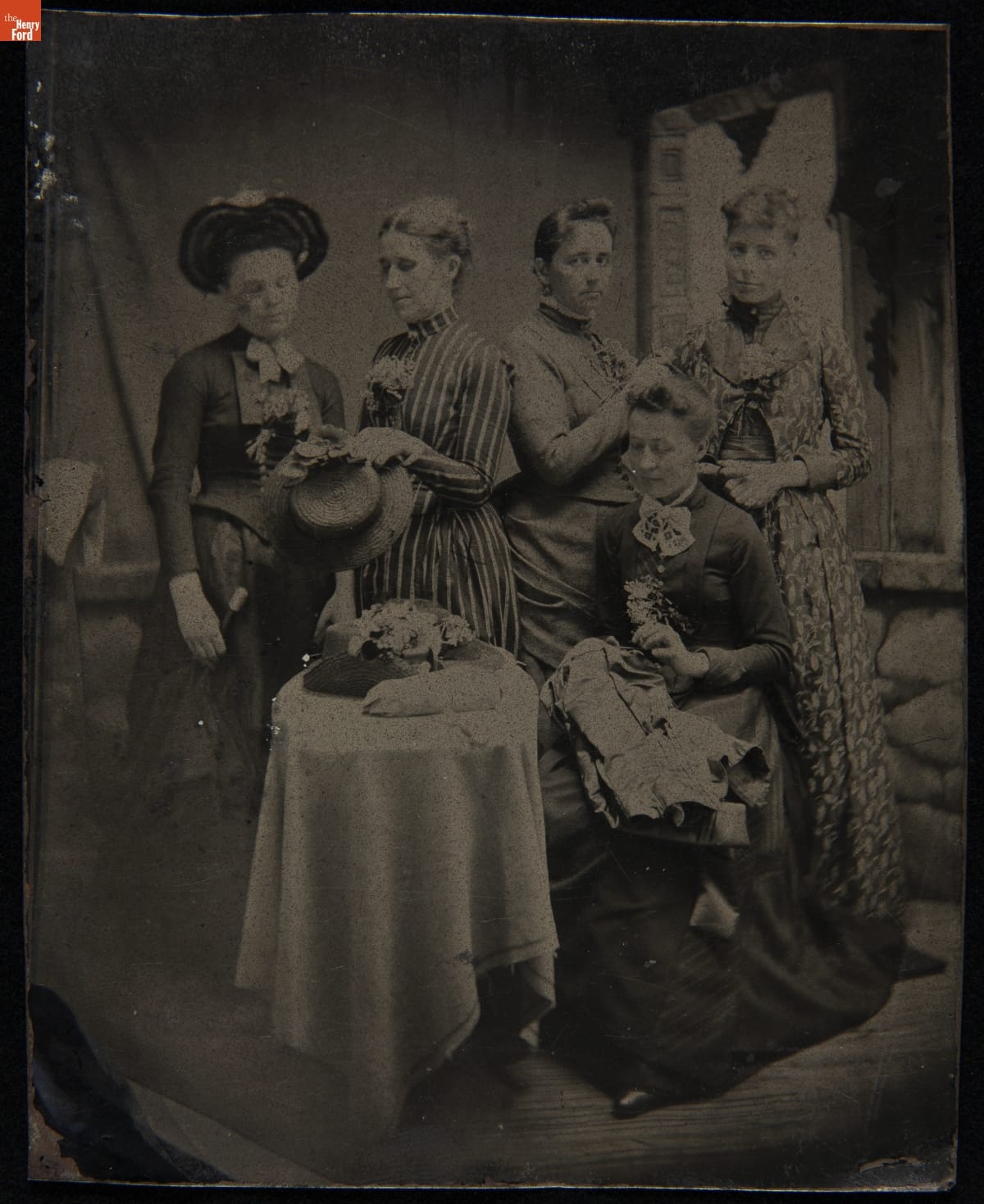 Mrs. Plumb and Friends Working on Clothing and Hats, circa 1885
