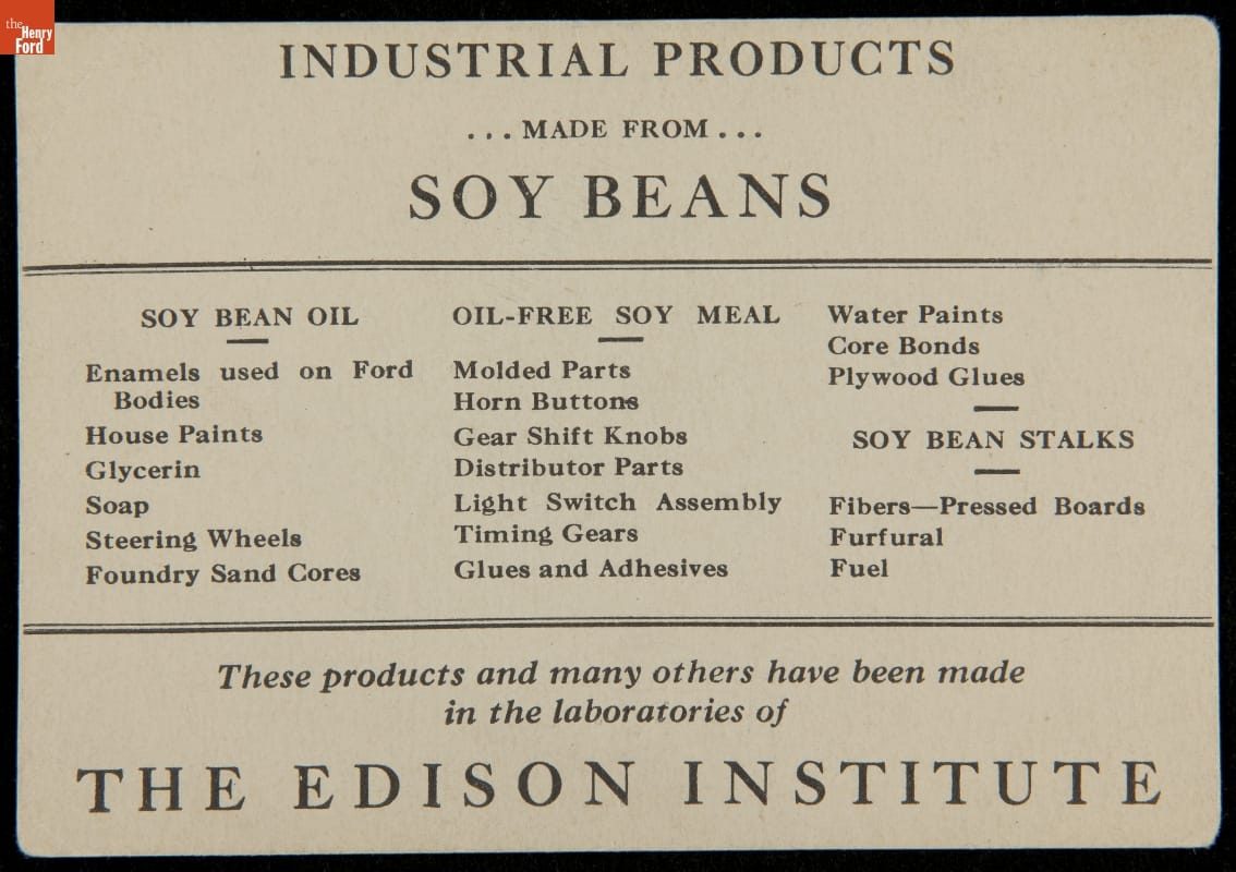 Starting in 1931, Henry Ford invested much money and research into soybeans. He viewed the crop as a bridge between agriculture and industry. Based on this work, soy-based materials were incorporated into Ford Motor Company vehicles. Soybean oil was used in body enamels, for example, while soy meal was used in the plastic for gear shift knobs and horn buttons.
