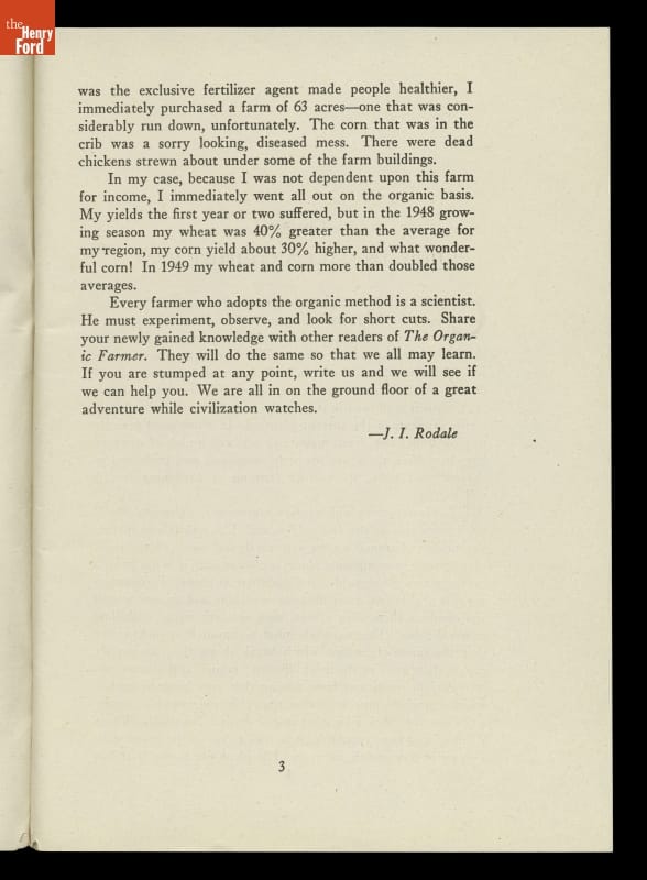 Jerome Irving (J.I.) Rodale used his publishing house, Rodale Press, to promote his unconventional theories of organic agriculture. He first published The Organic Method on the Farm in 1949. Rodale is justifiably the father of organic farming in the United States as many of his ideas are now in the mainstream. Organic foods are increasingly sought out by consumers.