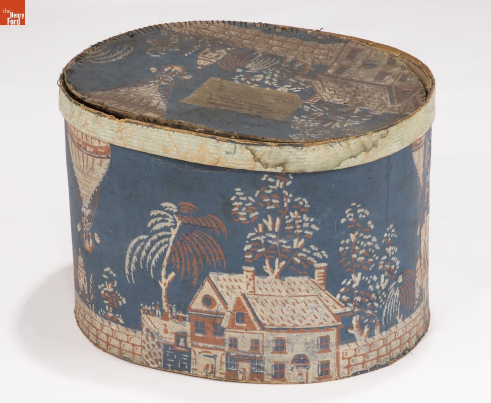 In the early 1800s, Americans used bandboxes to store clothing, accessories, and other small items. Bandboxes were handy containers in the home or when traveling by stage, boat, or rail. Manufacturers covered these inexpensive pasteboard or wooden boxes with colorful papers. W. R. Hitchcock, a Connecticut bandbox maker, covered this bandbox with a paper depicting the 1835 hot-air balloon ascent by Richard Clayton.