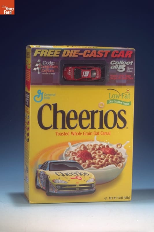 Stock car racing was the fastest-growing sport in the United States in the 1990s. NASCAR's success was reflected in this cereal box. Team sponsors long consisted mostly of companies associated with the automobile industry, or food and beverage makers whose products were sold at race tracks. By 2001, even breakfast cereals found potential customers in NASCAR's growing fan base.