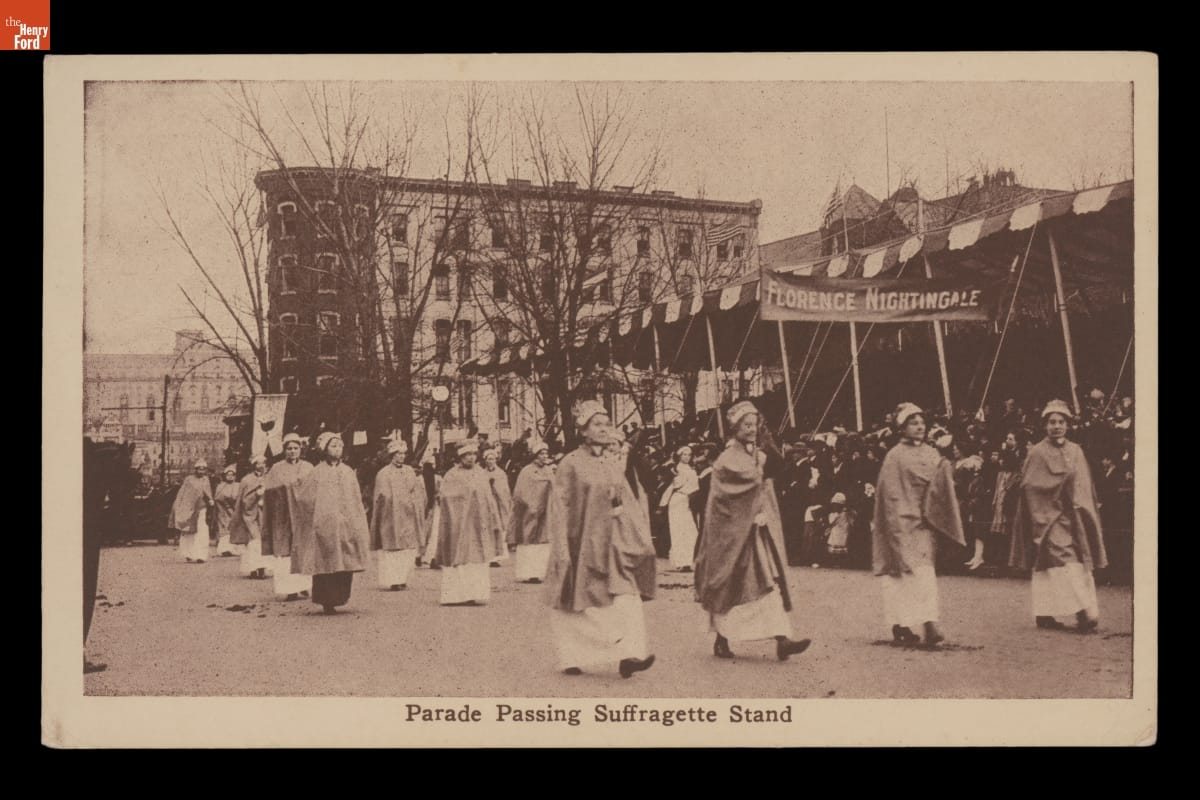 Alice Paul, a leader in the fight for women's suffrage, or equal voting rights, zealously targeted President Woodrow Wilson. The day before his first inauguration, Paul executed a parade of 8,000 women, who marched past the White House from the Capitol calling for suffrage. Sections of the well-orchestrated procession honored the contributions of working women, including these uniformed nurses.