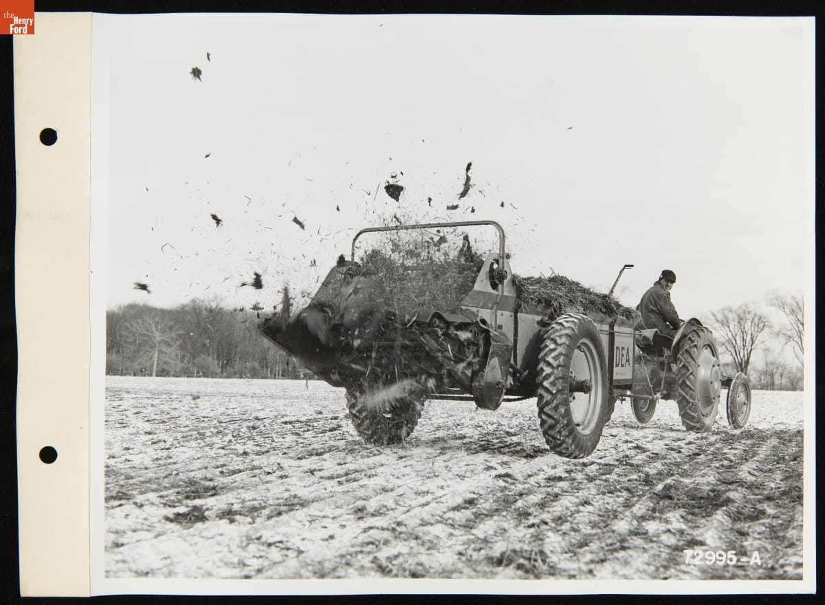 Man Driving a Ford Ferguson Tractor Pulling a Trailer of Manure to Spread over a Field, January 1940
