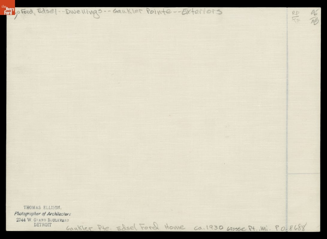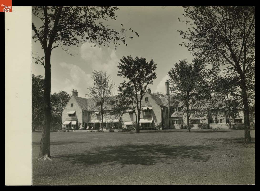 Edsel and Eleanor Ford moved into their home on Gaukler Pointe, near Grosse Pointe Shores, Michigan, in 1929. At the Fords' request, architect Albert Kahn designed the home in a style reminiscent of stone houses in the Cotswolds region of England. Noted landscape designer Jens Jensen planned the estate's grounds.