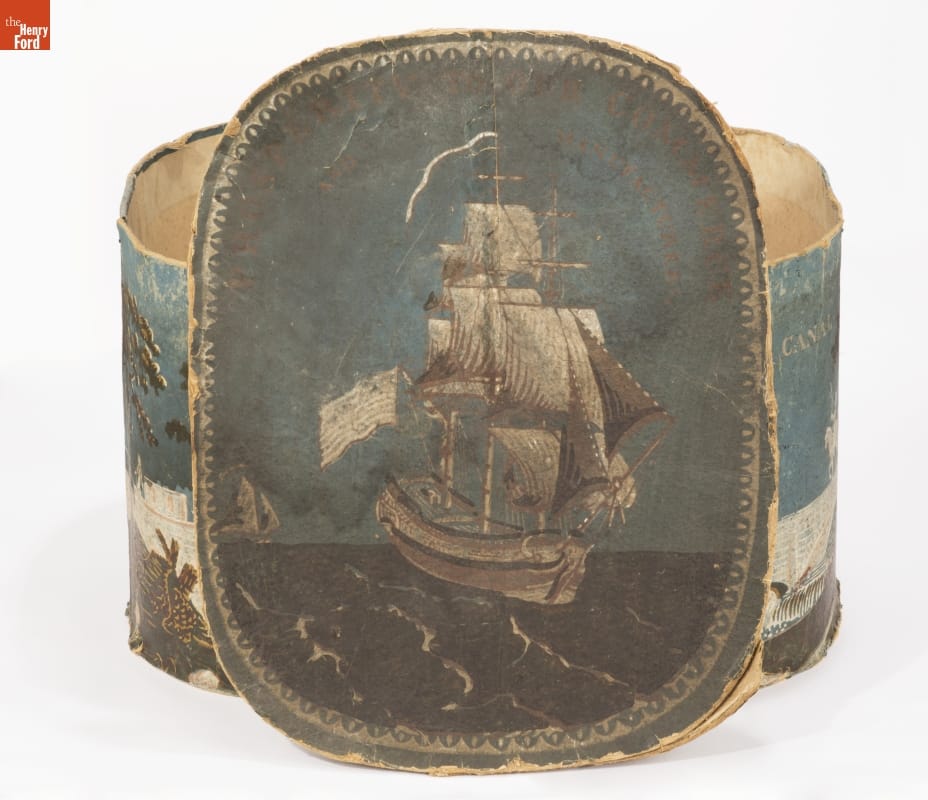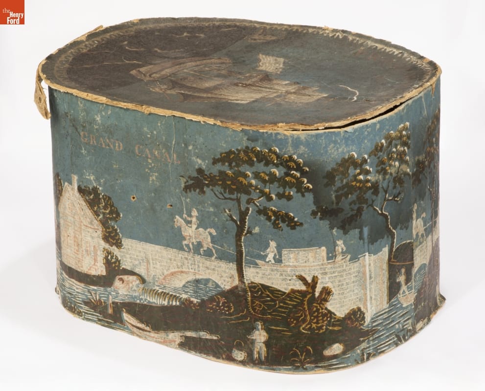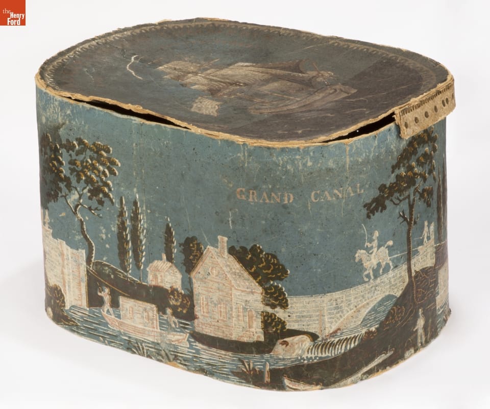 In the early 1800s, Americans used bandboxes to store clothing, accessories, and other small items. Bandboxes were handy containers in the home or when traveling by stage, boat, or rail. Manufacturers covered these inexpensive pasteboard or wooden boxes with colorful papers. This bandbox's paper depicts an ocean-going ship and a scene along New York's Erie Canal -- symbols of America's growing commercial and manufacturing prosperity.
