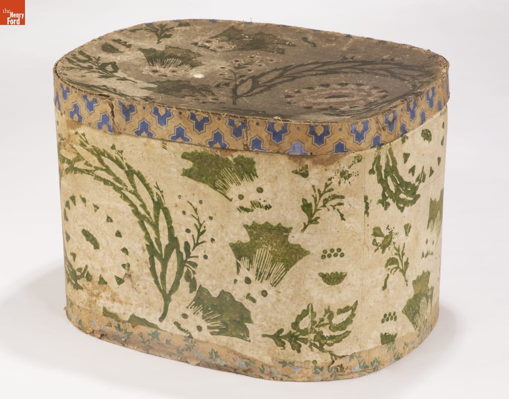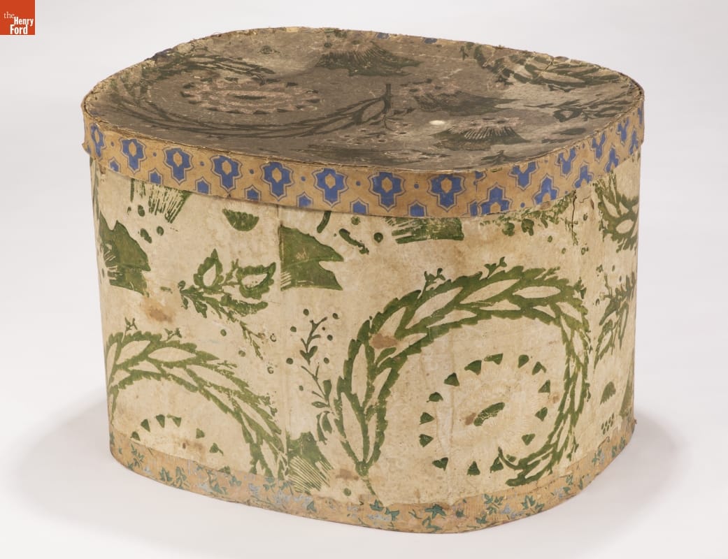 In the early 1800s, Americans used bandboxes to store clothing, accessories, and other small items. Bandboxes were handy containers in the home, or when traveling by stage, boat, or rail. Manufacturers covered these inexpensive pasteboard or wooden boxes with colorful papers. Some bandboxes were covered with papers depicting animals, places or specific scenes. Others, such as this one, were covered with decorative wallpaper of the day.