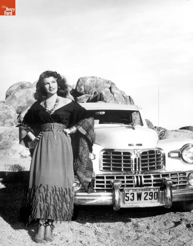 Actress Rita Hayworth posed with a 1947 Lincoln Continental convertible for this photograph. Hayworth was in costume for her film The Loves of Carmen. Then as now, movie stars were trendsetters who could turn a particular make or model into a fashionable status symbol.