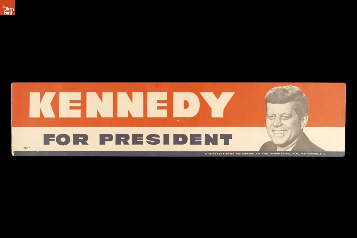 With campaign giveaways like this bumper sticker, Democratic presidential candidate John F. Kennedy launched an exhaustive campaign in 1960 against Republican opponent Vice President Richard M. Nixon. Despite charges that he lacked experience in foreign affairs and that his Catholic background would hurt him, Kennedy's knowledge and maturity eventually won him the very close 1960 election.