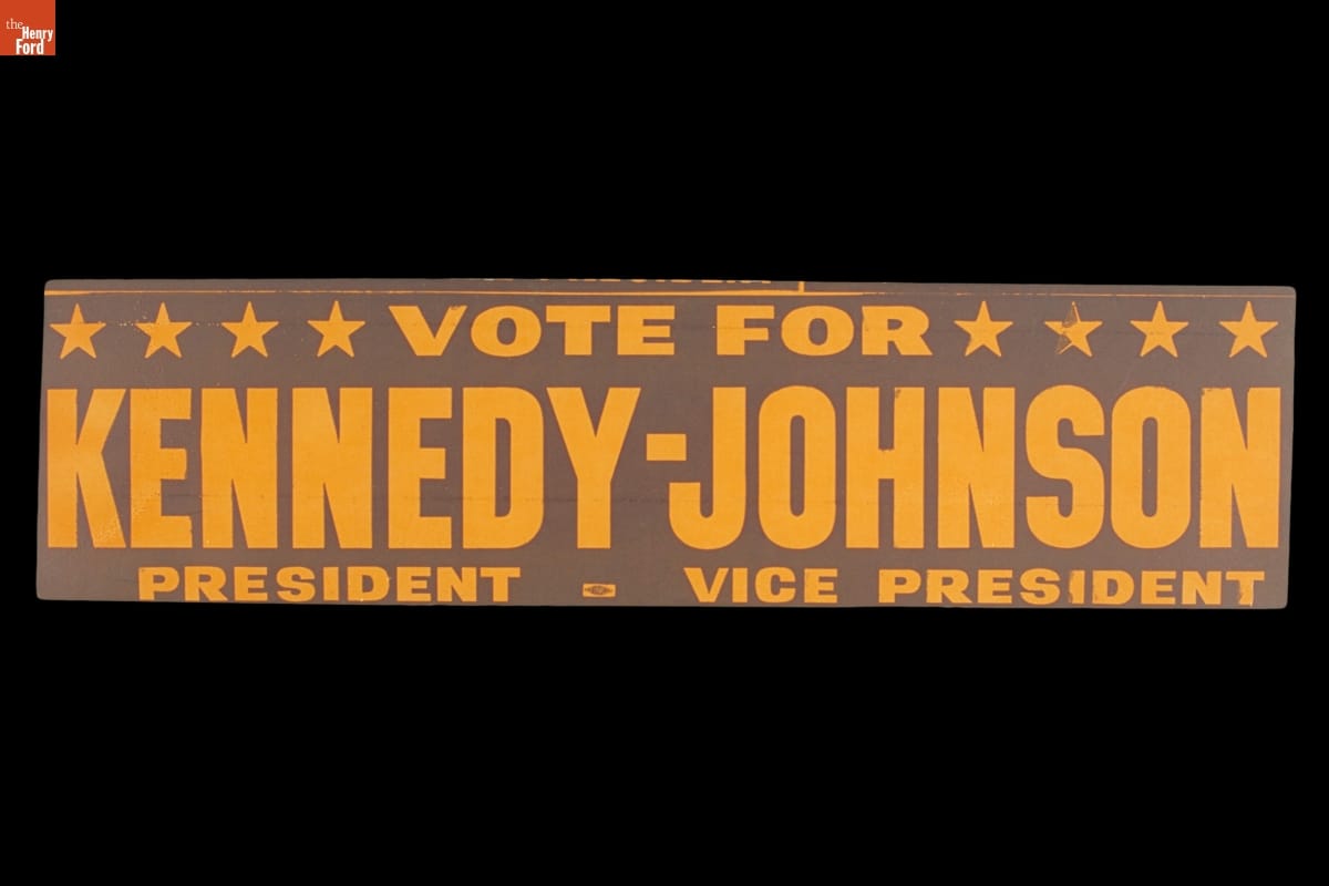This bumper sticker was produced for the 1960 Kennedy-Johnson presidential campaign. After John F. Kennedy defeated Texas Senator Lyndon B. Johnson in the 1960 Democratic primary, Kennedy named Johnson as his running mate. Johnson's addition brought on board an experienced old-school politician, and also provided a better chance of victory in the key swing states.