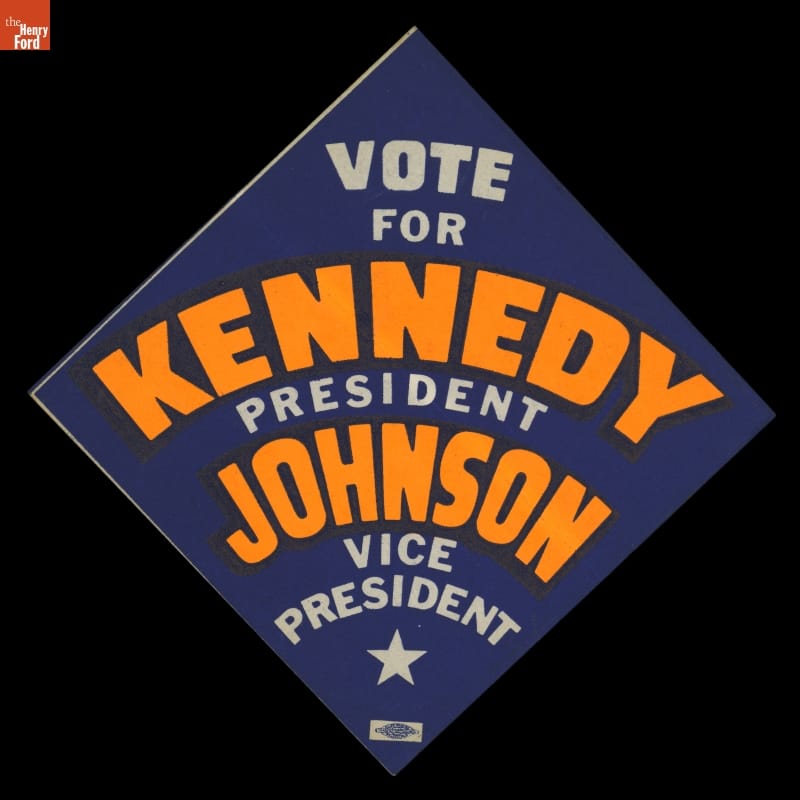 This bumper sticker was produced for the 1960 Kennedy-Johnson presidential campaign. After John F. Kennedy defeated Texas Senator Lyndon B. Johnson in the 1960 Democratic primary, Kennedy named Johnson as his running mate. Johnson's addition brought on board an experienced old-school politician, and also provided a better chance of victory in the key swing states.