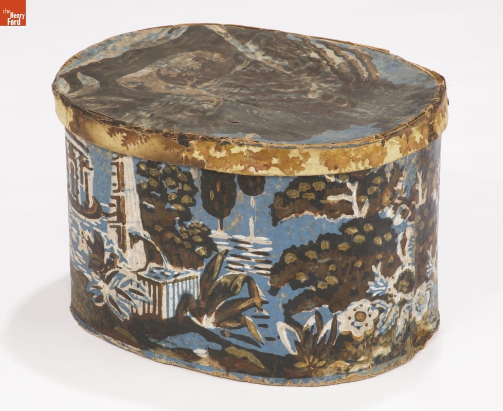 In the early 1800s, Americans used bandboxes to store clothing, accessories, and other small items. Bandboxes were handy containers in the home or when traveling by stage, boat, or rail. Manufacturers covered these inexpensive pasteboard or wooden boxes with colorful papers. This bandbox's paper depicts a garden scene with a domed, temple-like structure and fountain.