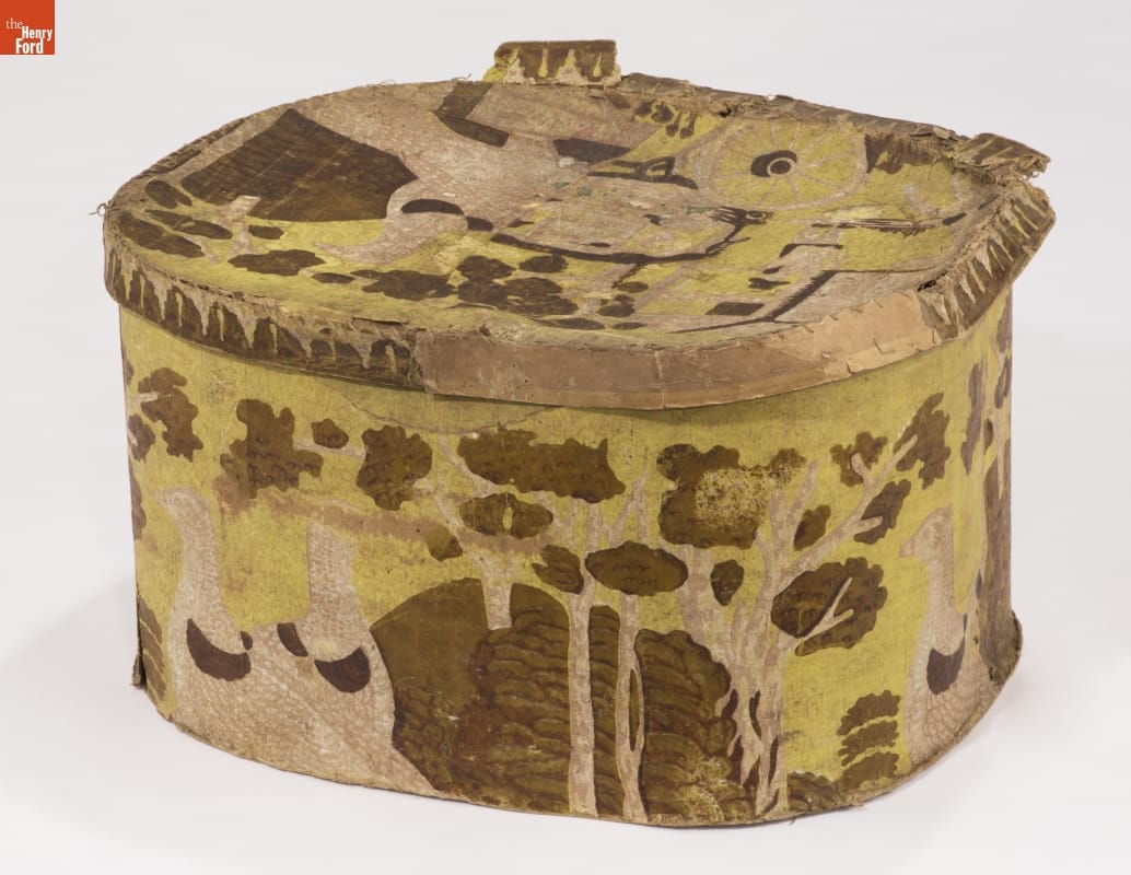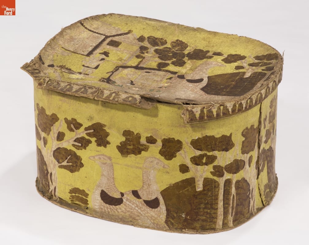 In the early 1800s, Americans used bandboxes to store clothing, accessories, and other small items. Bandboxes were handy containers in the home or when traveling by stage, boat, or rail. Manufacturers covered these inexpensive pasteboard or wooden boxes with colorful papers. Some bandboxes were covered with papers depicting birds and animals. This bandbox's paper shows two grouse in a woodland setting.