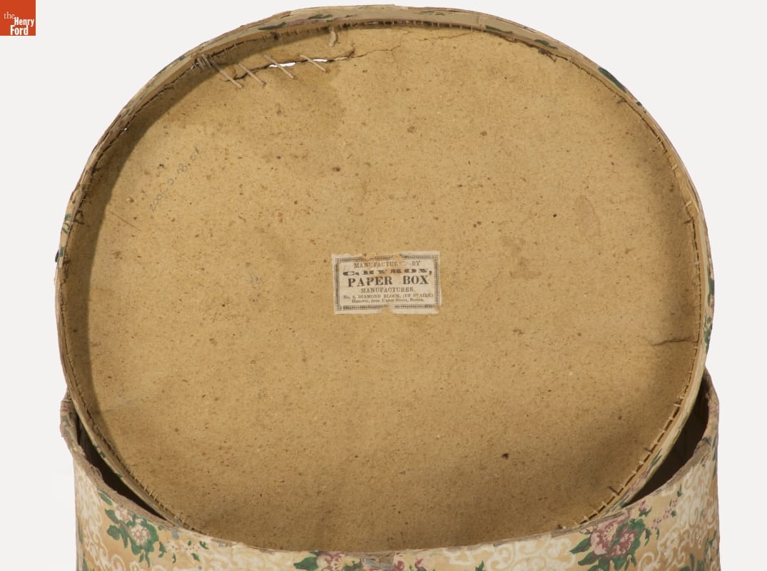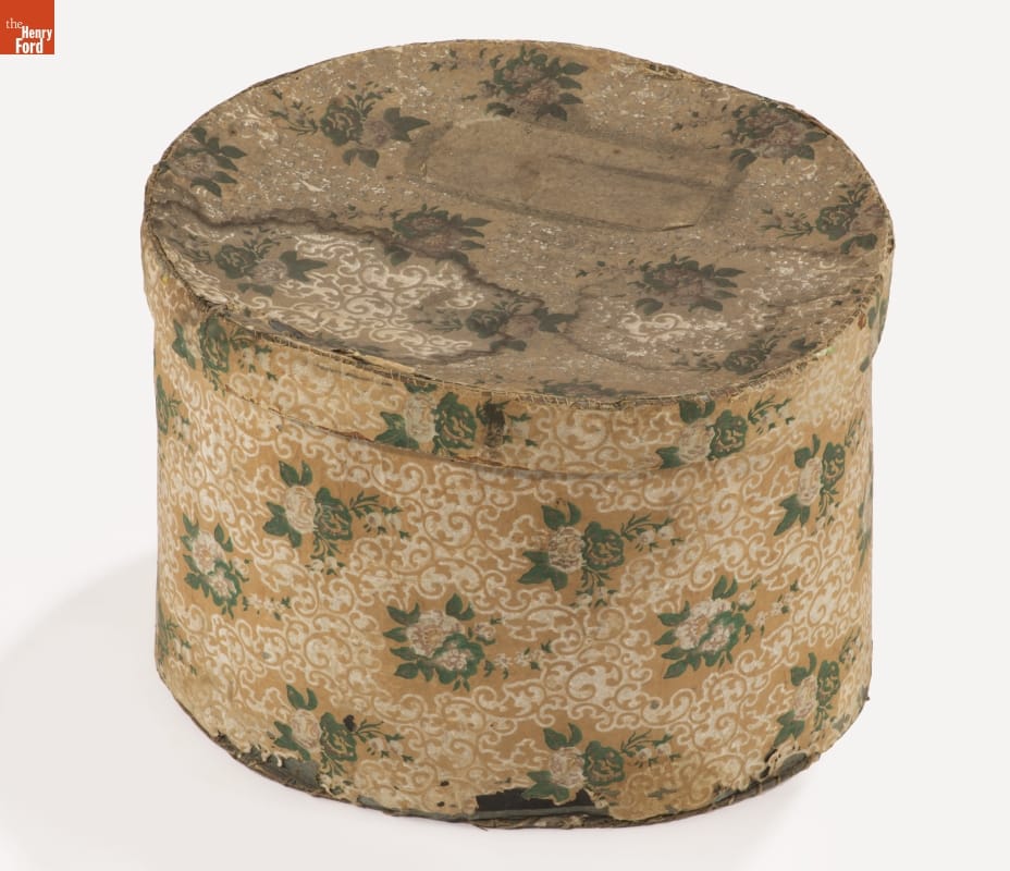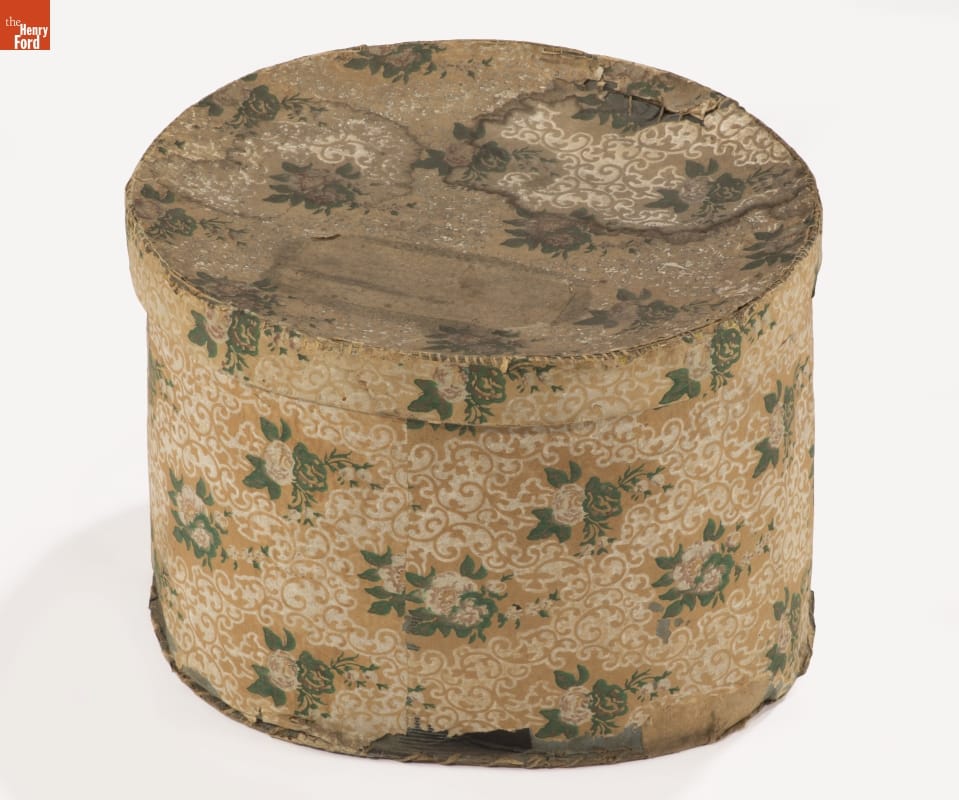 In the early 1800s, Americans used bandboxes to store clothing, accessories, and other small items. Bandboxes were handy containers in the home, or when traveling by stage, boat, or rail. Manufacturers covered these inexpensive pasteboard or wooden boxes with colorful papers. Some bandboxes were covered with papers depicting animals, places or specific scenes. Others, such as this one, were covered with decorative wallpaper of the day.