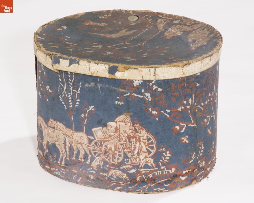 In the early 1800s, Americans used bandboxes to store clothing, accessories, and other small items. Bandboxes were handy containers in the home or when traveling by stage, boat, or rail. Manufacturers covered these inexpensive pasteboard or wooden boxes with colorful papers. This bandbox's paper depicts a scene with hunters loading their catch into a coach.