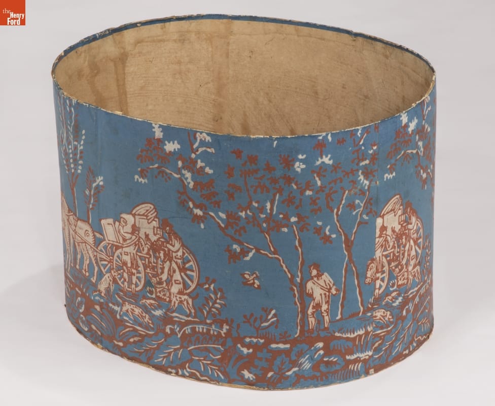 In the early 1800s, Americans used bandboxes to store clothing, accessories, and other small items. Bandboxes were handy containers in the home or when traveling by stage, boat, or rail. Manufacturers covered these inexpensive pasteboard or wooden boxes with colorful papers. This bandbox's paper depicts a scene with hunters loading their catch into a coach.