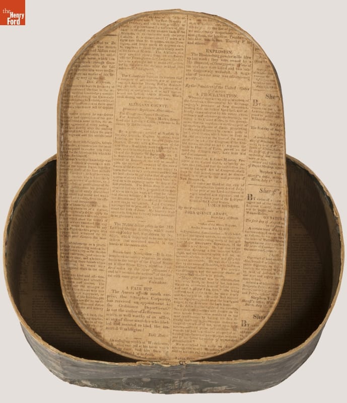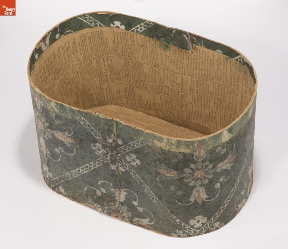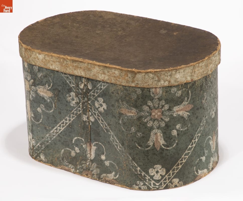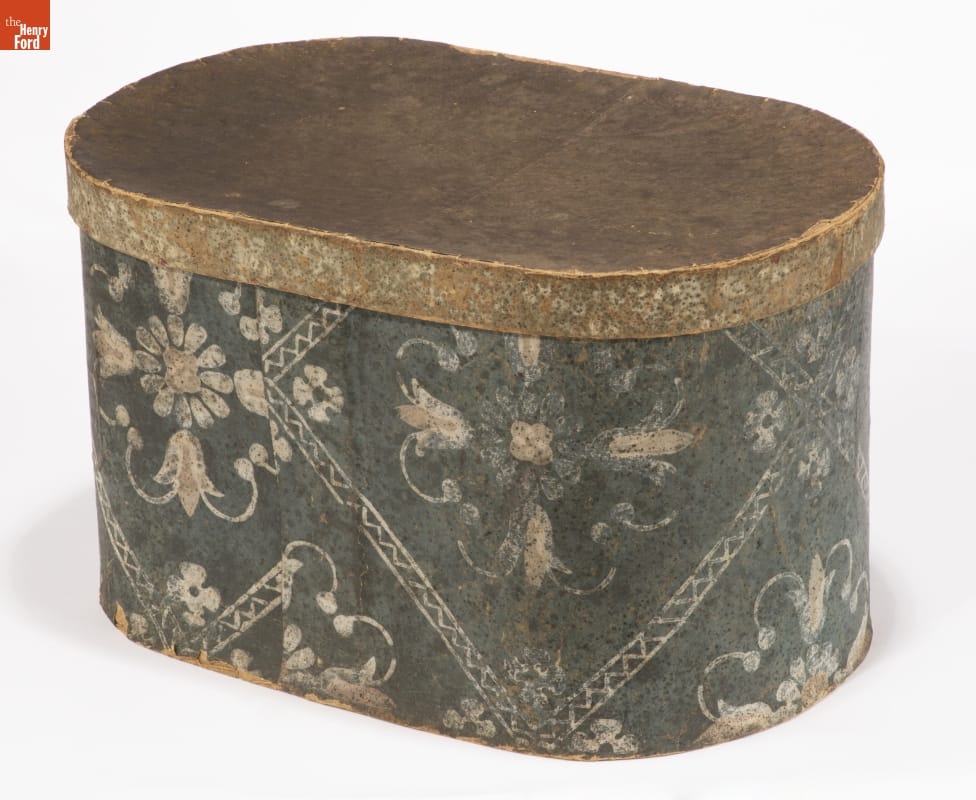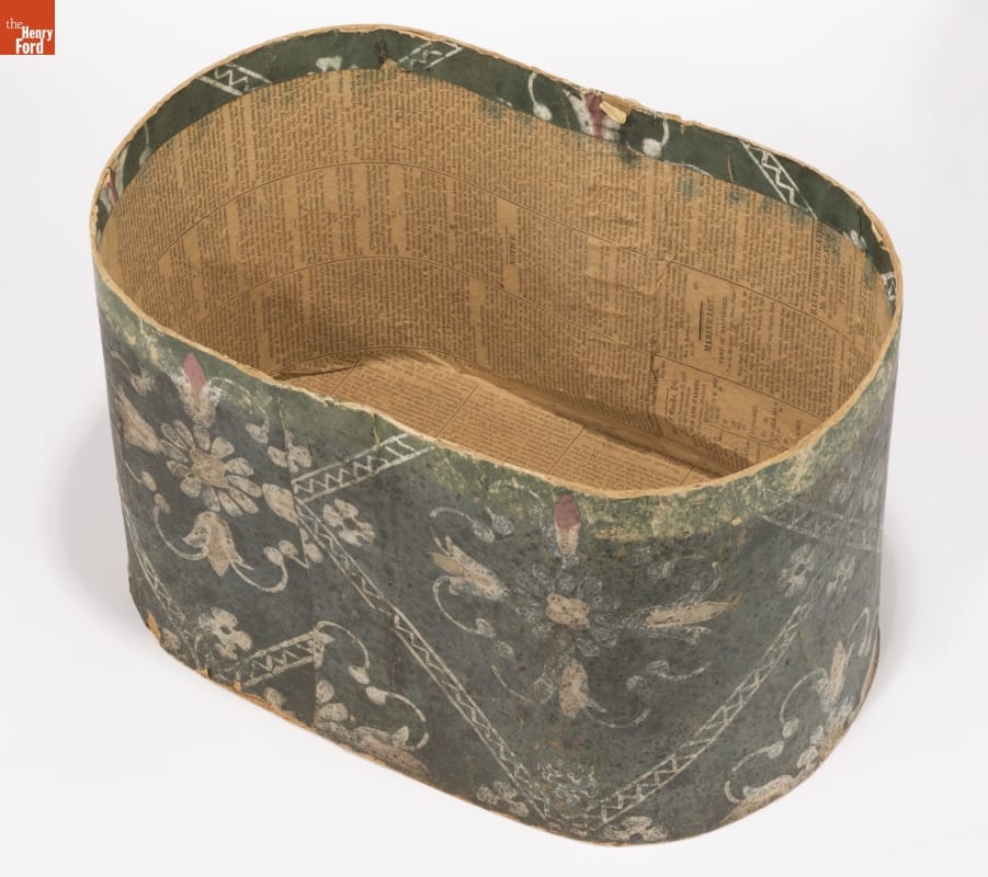 In the early 1800s, Americans used bandboxes to store clothing, accessories, and other small items. Bandboxes were handy containers in the home, or when traveling by stage, boat, or rail. Manufacturers covered these inexpensive pasteboard or wooden boxes with colorful papers. Some bandboxes were covered with papers depicting animals, places or specific scenes. Others, such as this one, were covered with decorative wallpaper of the day.