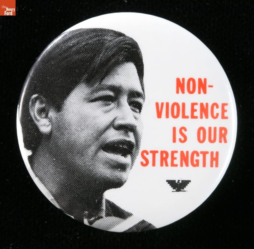 Cesar Chavez founded the National Farm Workers Association in 1962. His organization later merged with the Agricultural Workers Organizing Committee to form the United Farm Workers (its logo is a stylized eagle seen on this button). Chavez fought tirelessly for the dignity of all farm workers and sought recognition, through nonviolent means, for the union that represented them.