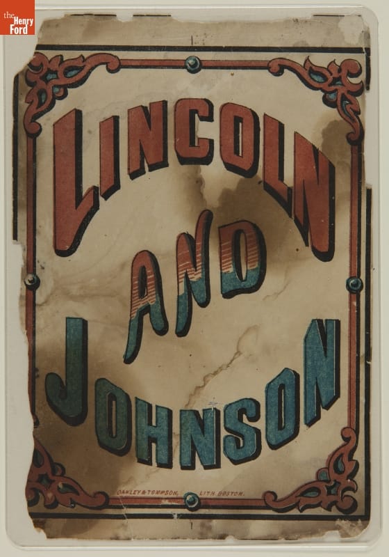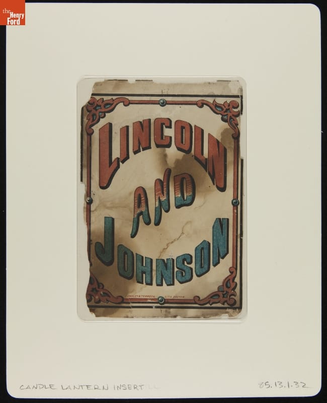 Late-nineteenth-century political parties rallied their supporters by holding torchlight parades. In the evening, marchers lit up the street carrying torches, lamps and lanterns. Many of these political lanterns glowed with the names of the candidates, slogans and patriotic symbols. Supporters of Abraham Lincoln and Andrew Johnson--the Union Republican ticket--would have placed this paper insert into a campaign lantern during the 1864 presidential election.