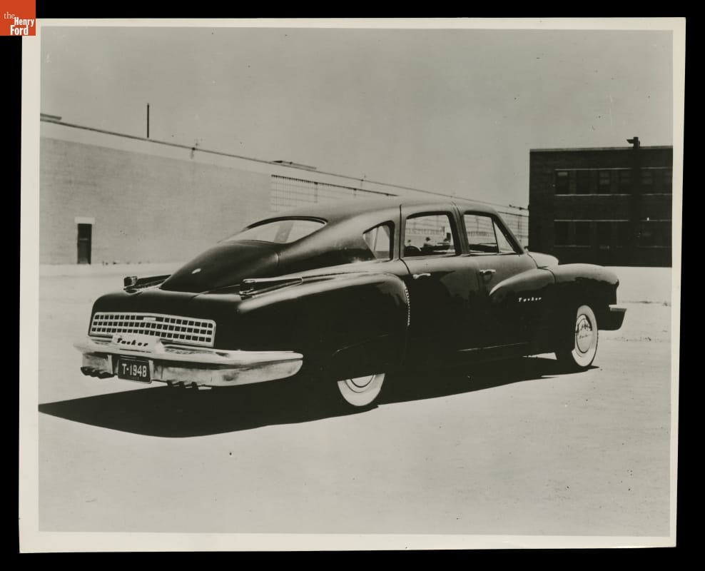Preston Tucker's futuristic Tucker 48 was unlike anything else on the road in the late 1940s. The final body design was by Alex Tremulis who, in a long career, also produced designs for Auburn-Cord-Duesenberg, American Bantam, Packard, Ford, and others. Tucker hallmarks included its three headlights, rear fender vents (for the rear-mounted engine), and doors cutting into the roof.