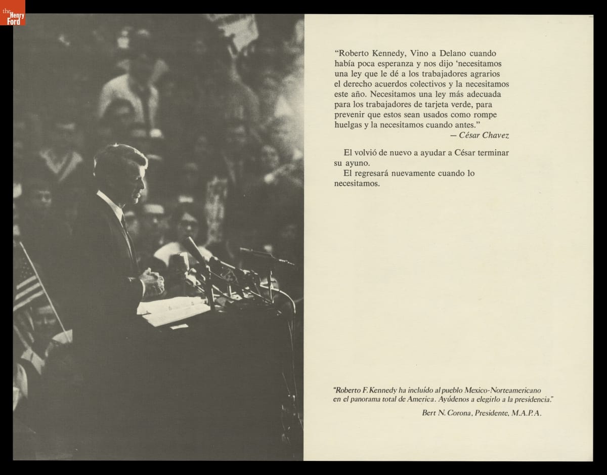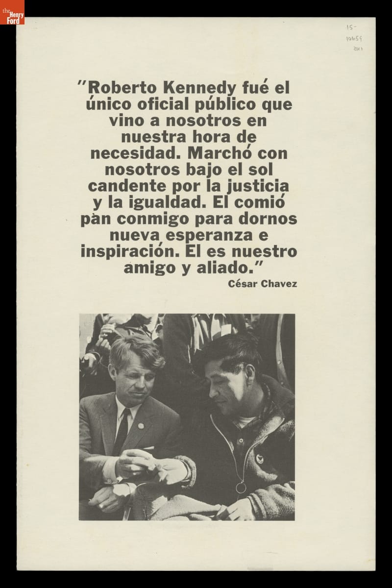 Senator Robert Kennedy traveled to Delano, California, to support Cesar Chavez as he ended a 25-day hunger strike on March 10, 1968. Chavez's coordination of the Delano grape-pickers strike taught Kennedy to appreciate the power of organized farm labor. Kennedy used this image to his political advantage when he launched his run for the Democratic Party presidential nomination shortly thereafter.