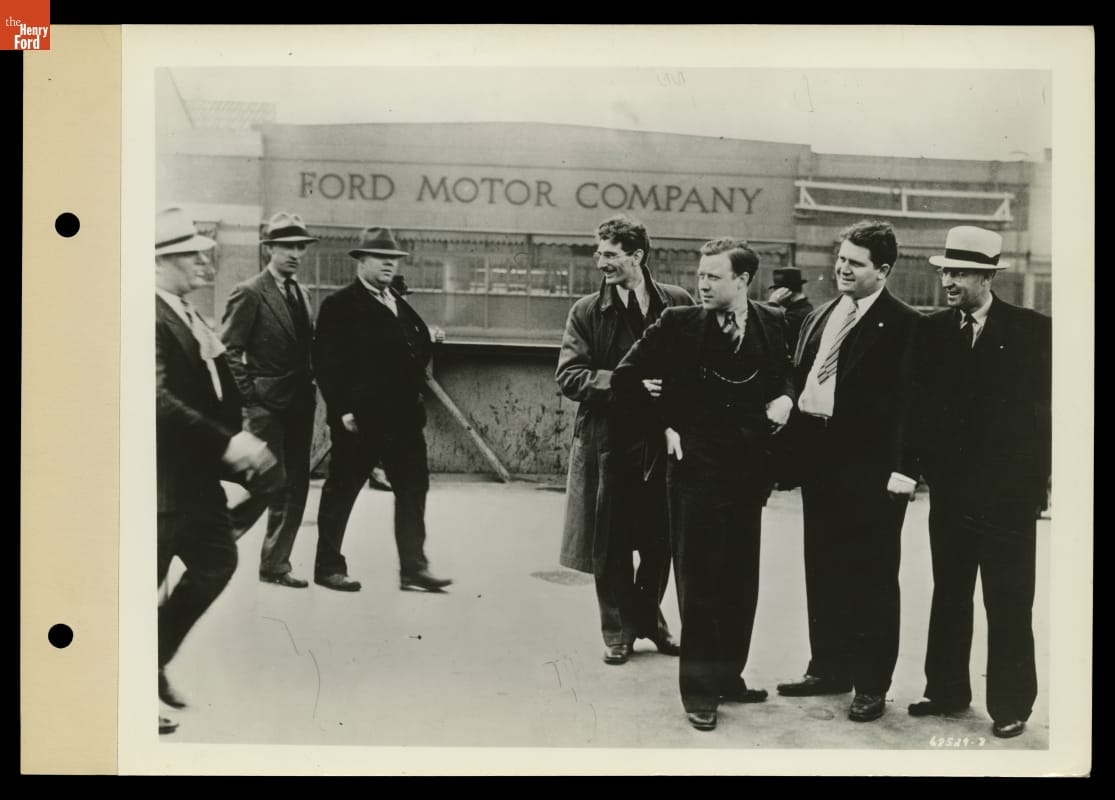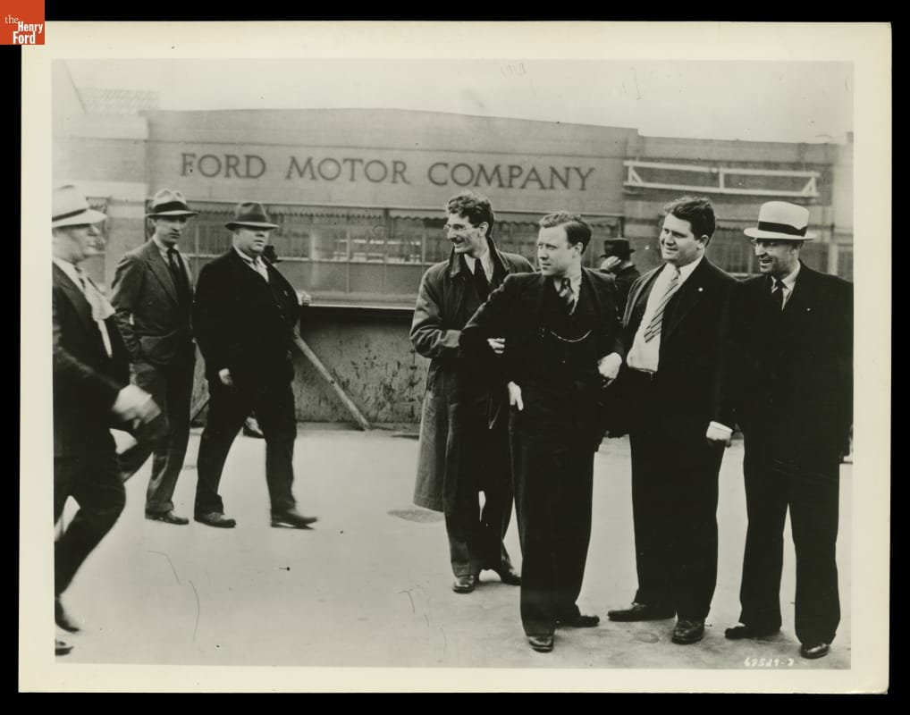 Ford Motor Company refused to recognize the United Auto Workers (UAW) labor union. On May 26, 1937, men from Ford's Service Department (left) attacked labor organizers (right) Robert Kanter, Walter Reuther, Richard Frankensteen, and J.J. Kennedy on a pedestrian overpass at Ford's Rouge Plant. This "Battle of the Overpass" came to symbolize the struggle to unionize Ford. The UAW ultimately succeeded in 1941.