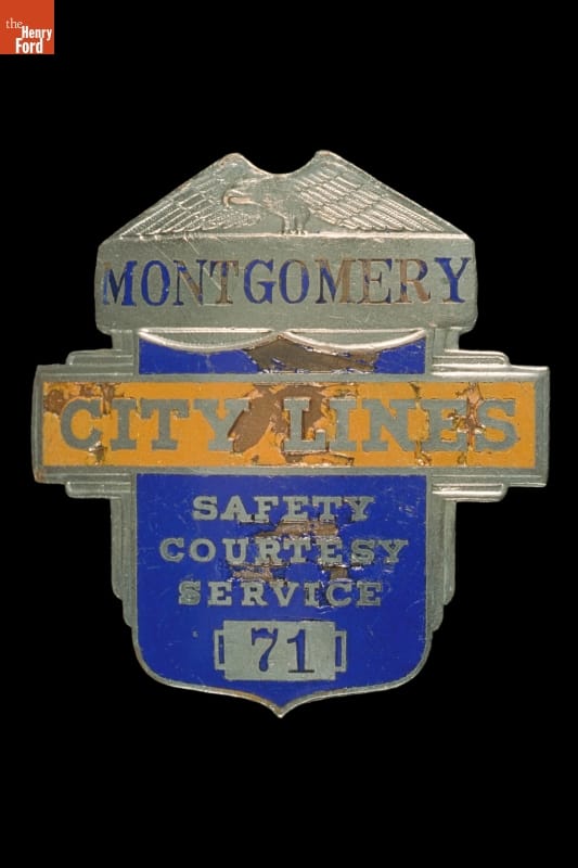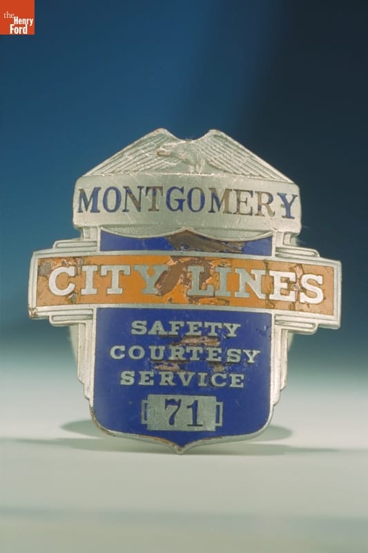 This badge was worn in the 1950s by a driver for the Montgomery (Alabama) City Bus Lines. While riding a Montgomery bus in 1955, Rosa Parks refused to give up her seat to a white man, leading to a widespread bus boycott by African Americans.