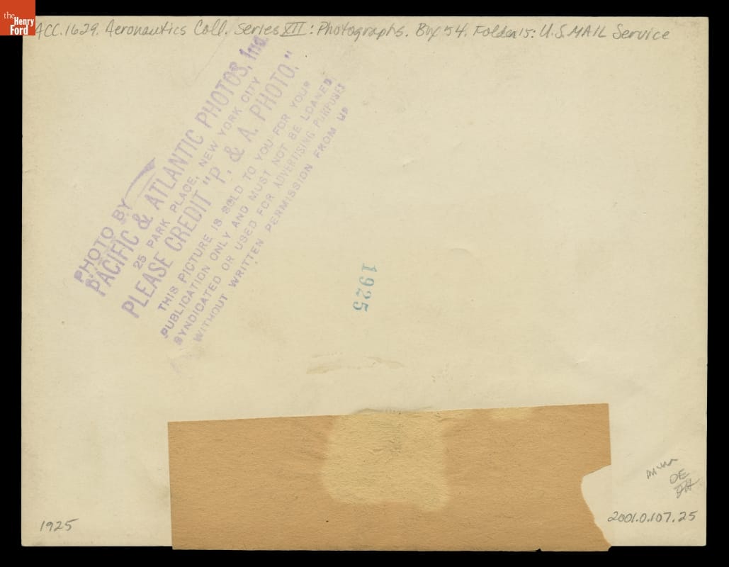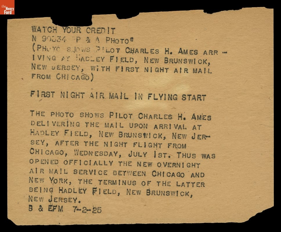 Typed sheet, now detached, reads in part: ...PILOT CHARLES H. AMES DELIVERING THE MAIL UPON ARRIVAL AT HADLEY FIELD, NEW BRUNSWICK, NEW JERSEY, AFTER THE NIGHT FLIGHT FROM CHICAGO, WEDNESDAY, JULY 1st. THUS WAS OPENED OFFICIALLY THE OVERNIGHT AIR MAIL SERVICE BETWEEN CHICAGO AND NEW YORK, THE TERMINUS OF THE LATTER BEING HADLEY FIELD, NEW BRUNSWICK, NEW JERSEY.