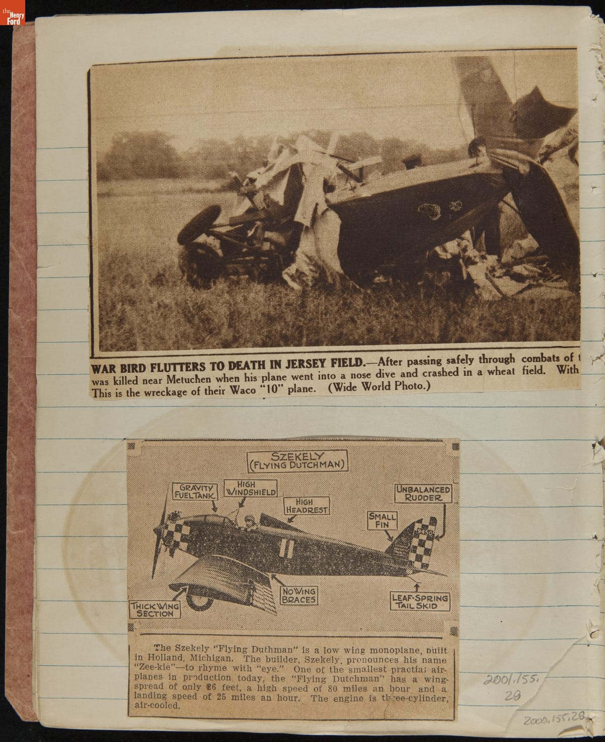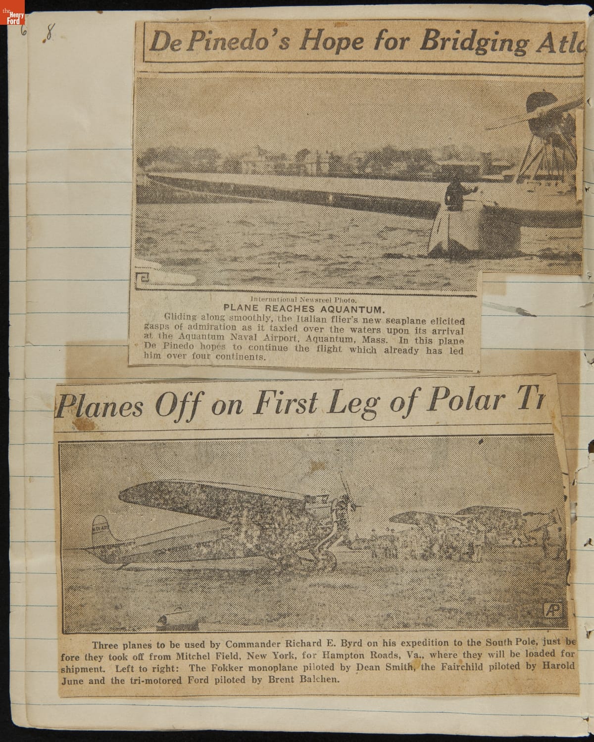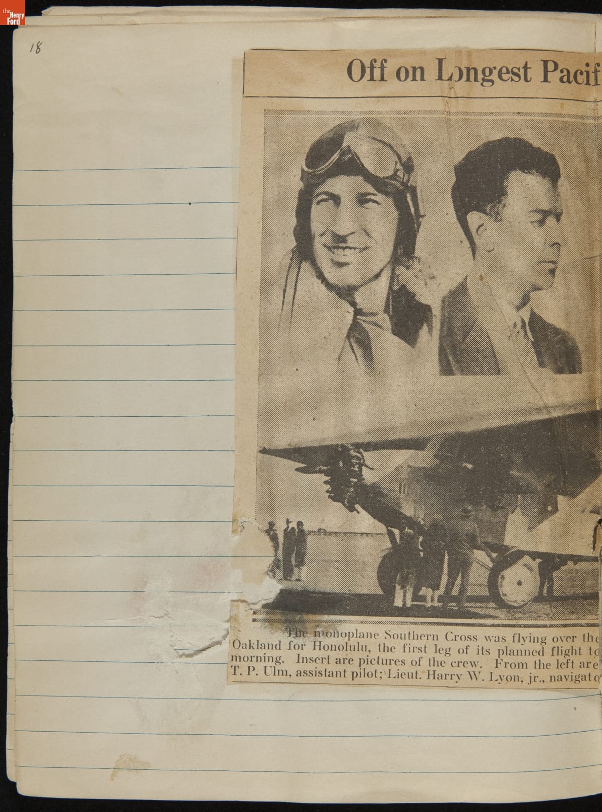 Kenneth Henderson compiled this scrapbook around 1928. It included photographs and newspaper clippings related to some of the top pilots and airplanes of the day. William Brock, Richard Byrd, Anthony Fokker, Charles Lindbergh, and Edward Schlee were among the aviators Henderson documented.