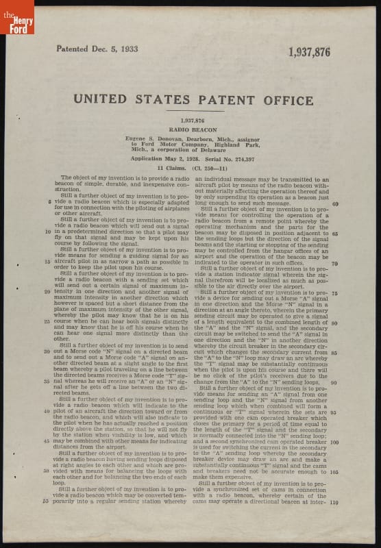 The radio beacon may be Henry Ford's most important contribution to aviation. Early pilots depended on landmarks, preventing reliable navigation in bad weather. Ford's engineers developed a radio beacon that simultaneously transmitted the Morse code letter "A" (dot-dash) in one direction and the letter "N" (dash-dot) in another. The pilot steered until the separate signals merged into a steady hum.