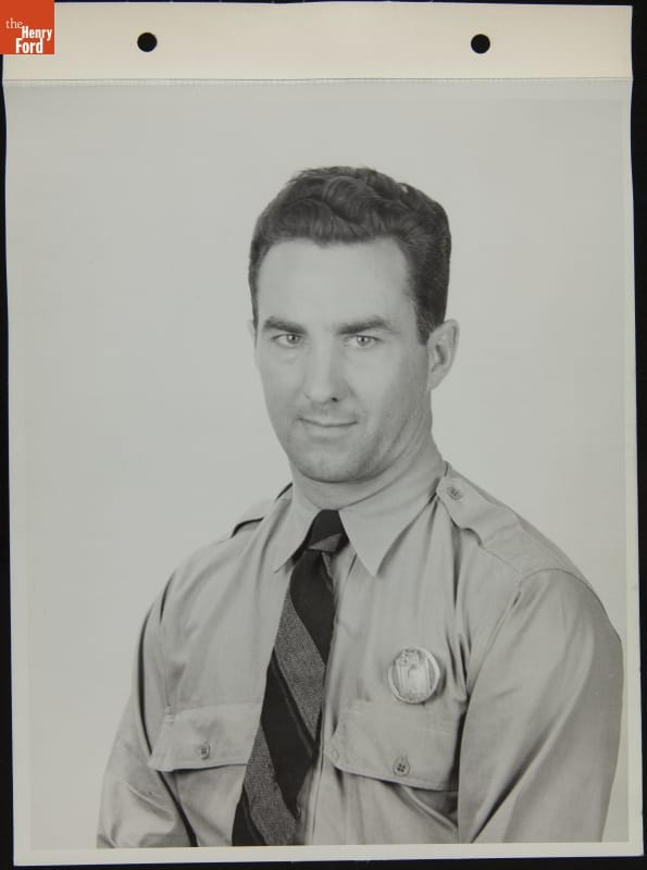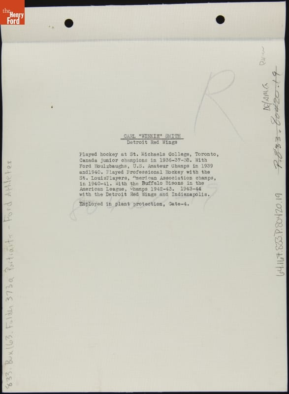Carl "Winky" Smith played amateur and professional hockey from 1933 to 1949. He played most of his career in the minor leagues but did play seven games for the Detroit Red Wings in the 1943-1944 season. This photo was taken while Smith was employed in plant protection at Gate 4 at Ford Motor Company's Rouge factory complex in Dearborn, Michigan.