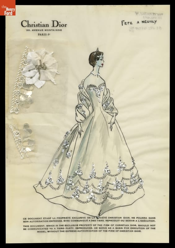 Christian Dior Fashion Design Drawing with Fabric Swatch, "Fete a Neuilly," 1955