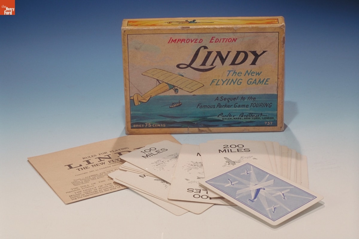 top of product package: IMPROVED EDITION / LINDY / THE NEW FLYING GAME / A SEQUEL TO THE FAMOUS PARKER GAME TOURING / PARKER BROTHERS INC. SALEM, MASS., NEW YORK, LONDON / 737 / PRICE 75 CENTS