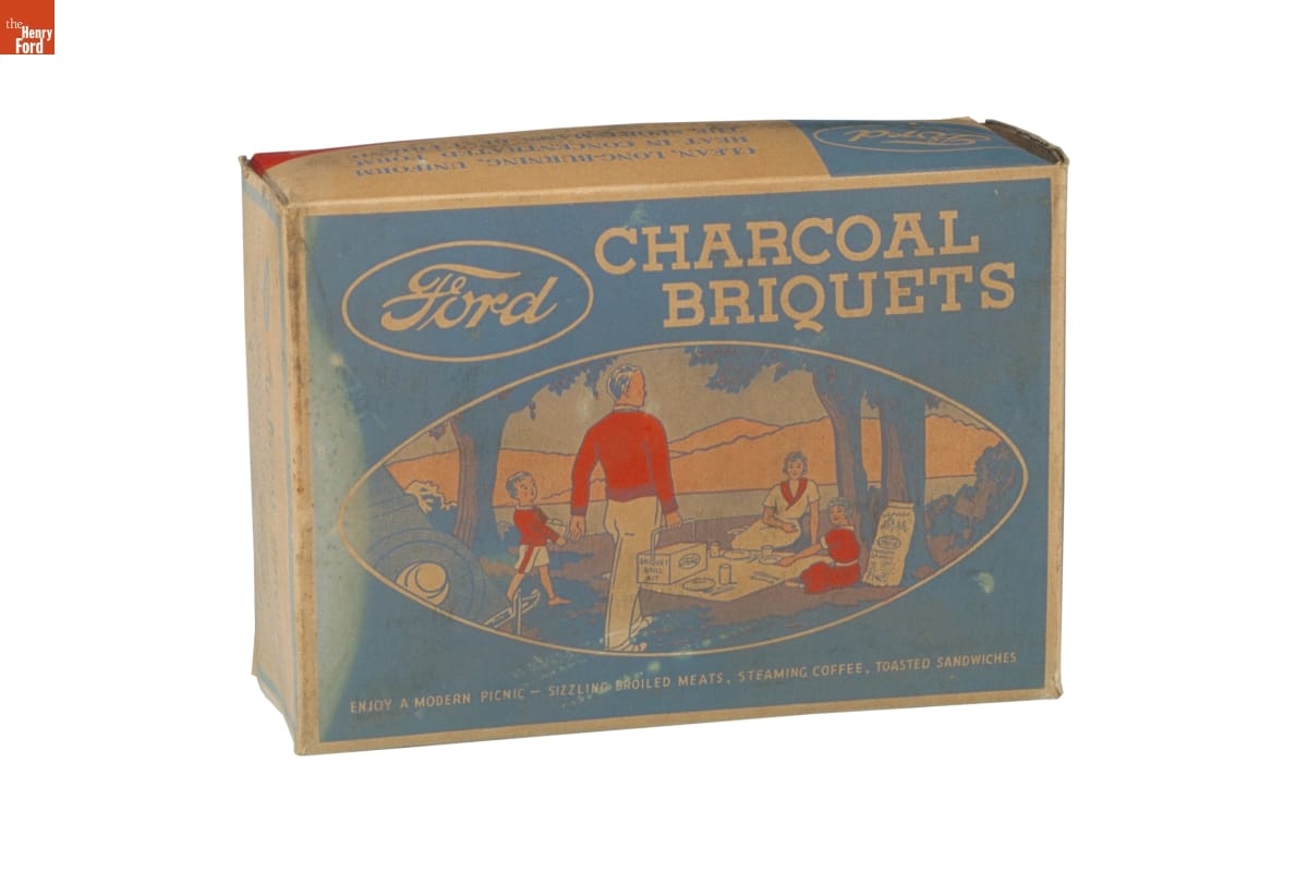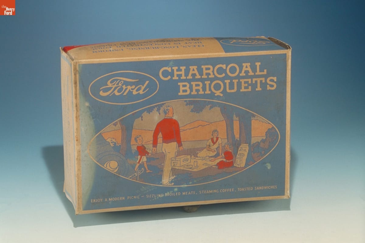 Ford Motor Company sawmills created heaps of wood wastes. Some was used to produce steam for factory operations. The rest was carbonized and compressed into charcoal. Workers mixed charred hardwood chips with starch, forming nearly 100 tons of charcoal briquettes each day. Dealers sold branded barbecue accessories and packages of the popular briquettes in Ford dealerships across the country.