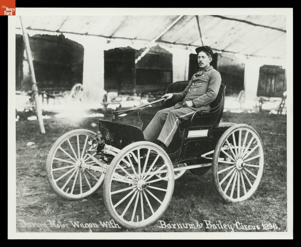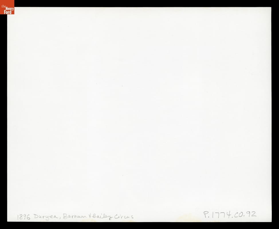 Early automobiles were more of a curiosity than practical transportation. Duryea Motor Wagon Company was the first American firm to try to make a business of building and selling automobiles. In this photograph, a Duryea is displayed by the Barnum & Bailey Circus in 1896 -- an excellent advertisement for the company. The only known surviving 1896 Duryea is in the collections of The Henry Ford.