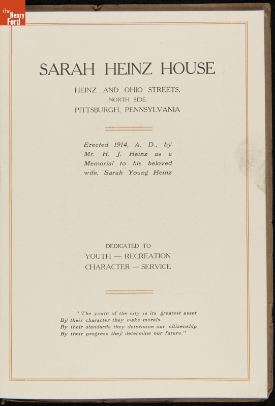 "Sarah Heinz House...Dedicated to Youth--Recreation, Character--Service," 1915