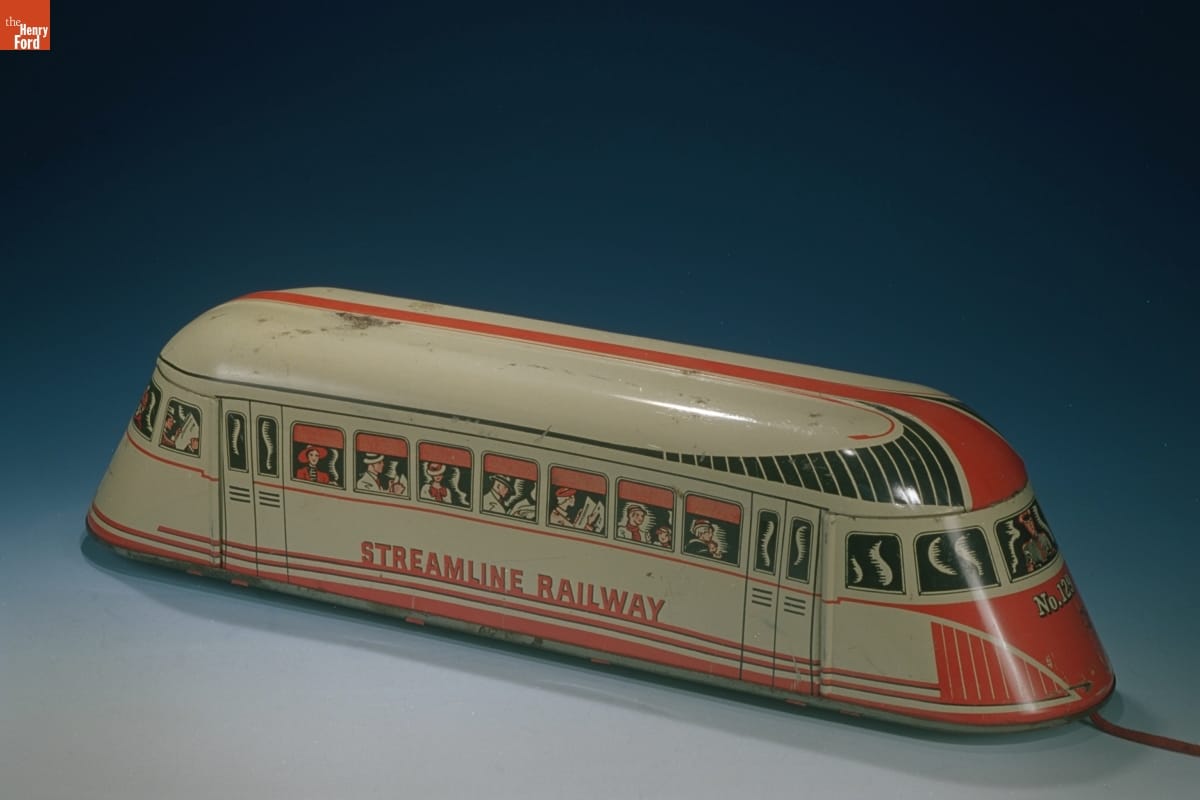 Transportation toys have reflected larger technological innovations in society, in both their use of different materials and the types of vehicles they have represented, such as this streamlined railway car. The Wolverine Supply and Manufacturing Company was founded in 1903 by B. F. Bain, who hailed from Wolverine, Michigan. The company was known for its pressed steel toys and sand toys.