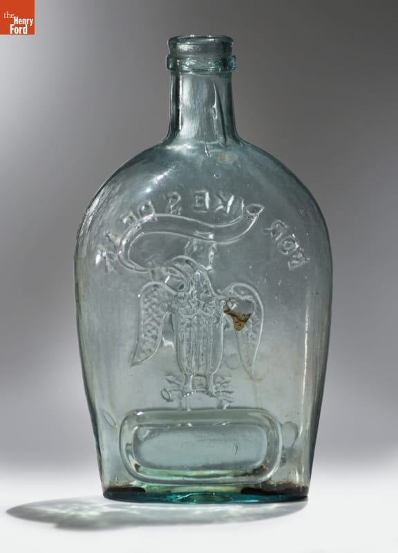 Glass factories in America began producing inexpensive, mold-formed flasks in the early 1800s. These figured flasks, often decorated with symbols of national pride or political or cultural affiliation, appealed to America's common man. Those who dreamed of striking it rich also found their aspirations molded in glass. This flask contains an image of a prospector bound "For Pikes Peak" -- an area rumored with gold.