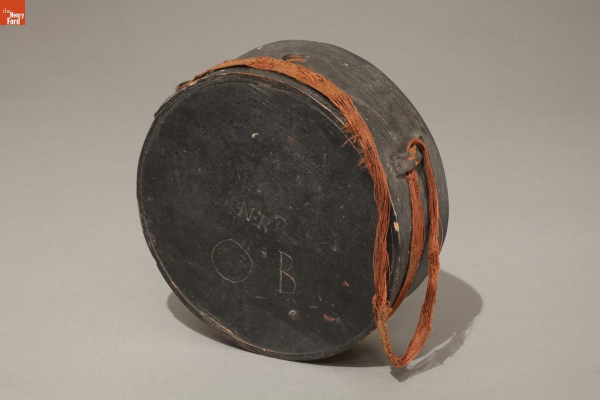 This canteen, called a "cheesebox" for its similarity to boxes made to hold wheels of cheese, identifies the Massachusetts Militia (M.S.). A number of similarly decorated canteens survive. The reverse is labeled N.R., possibly a maker's mark. The O B scratched into the surface may be the militia member's initials or those of a later owner.