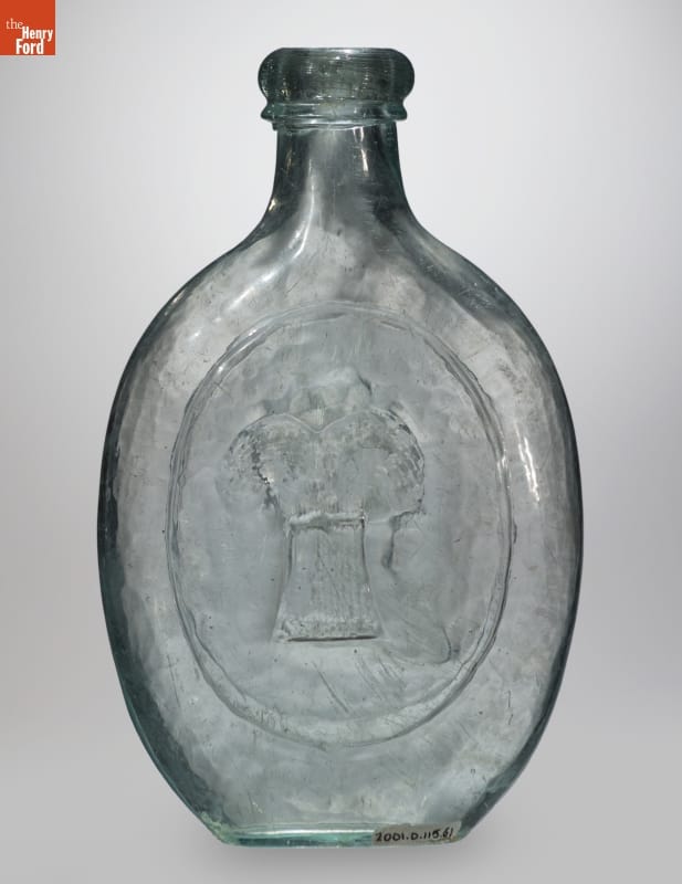 Glass factories in America began producing inexpensive, mold-formed flasks in the early 1800s. These figured flasks, often decorated with symbols of national pride or political or cultural affiliation, appealed to America's common man. The likeness of George Washington was a popular image found on these flasks; and the sheaf of grain was readily identifiable to citizens in the predominantly rural country.
