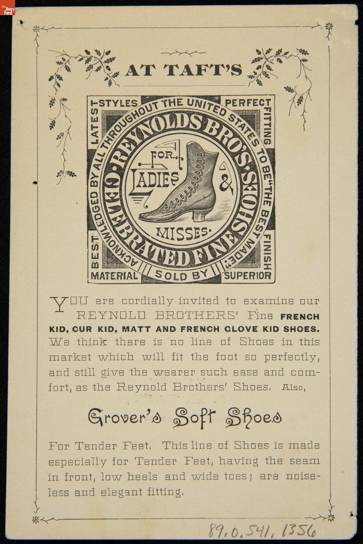 Trade Card for Reynolds Brothers Fine Shoes, S.K. Taft, 1880-1900