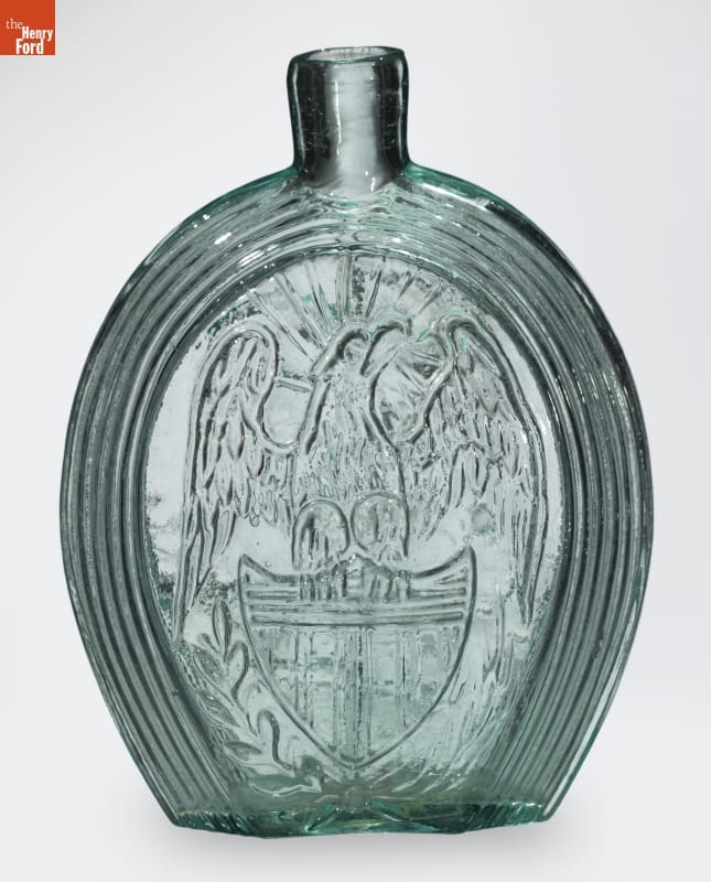 Glass factories in America began producing inexpensive, mold-formed flasks in the early 1800s. These figured flasks, often decorated with symbols of national pride or political or cultural affiliation, appealed to America's common man. Many flasks, like this one, contain images of an eagle -- a traditional symbol for America. The American flag found on the reverse completes the patriotic theme of this flask.