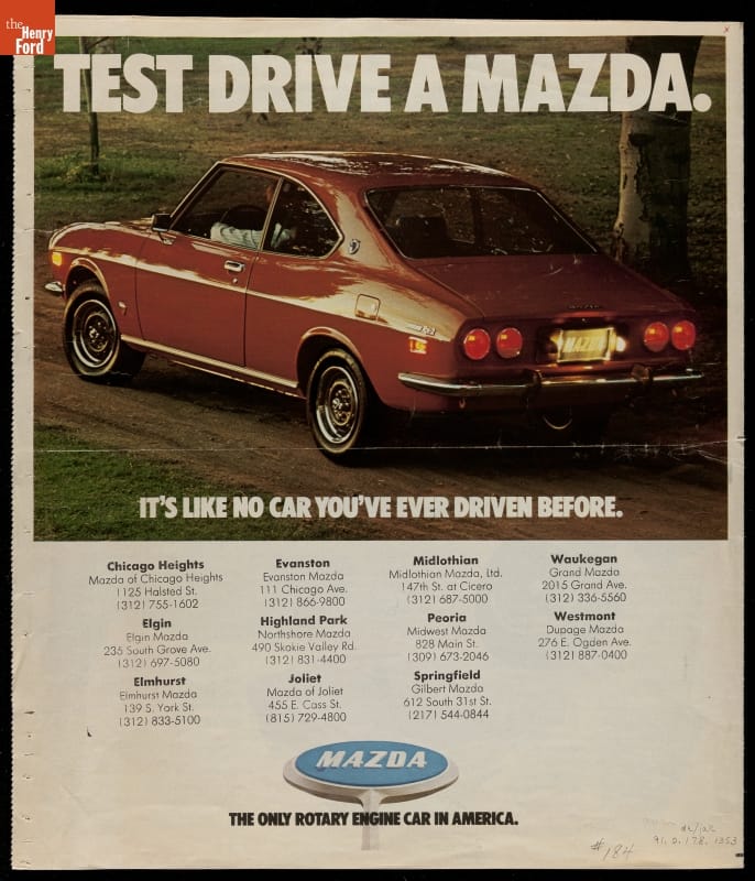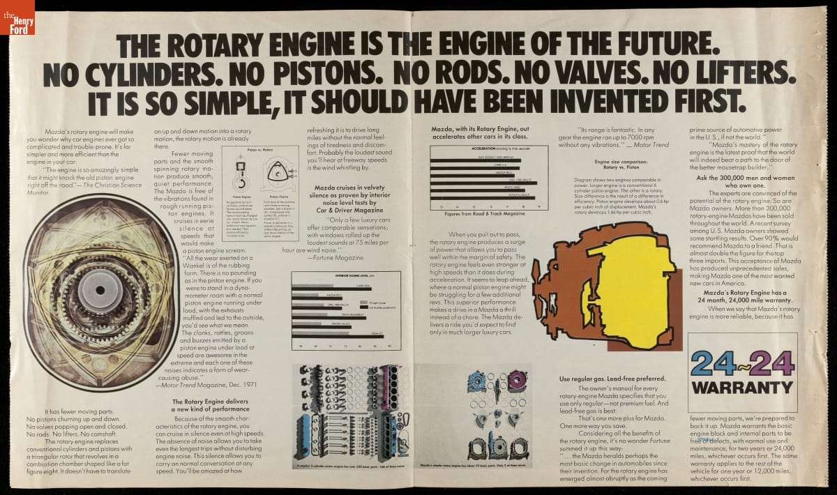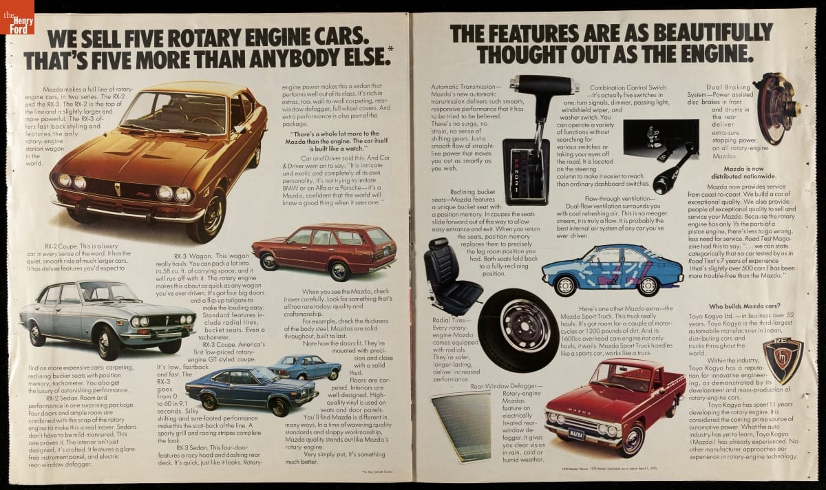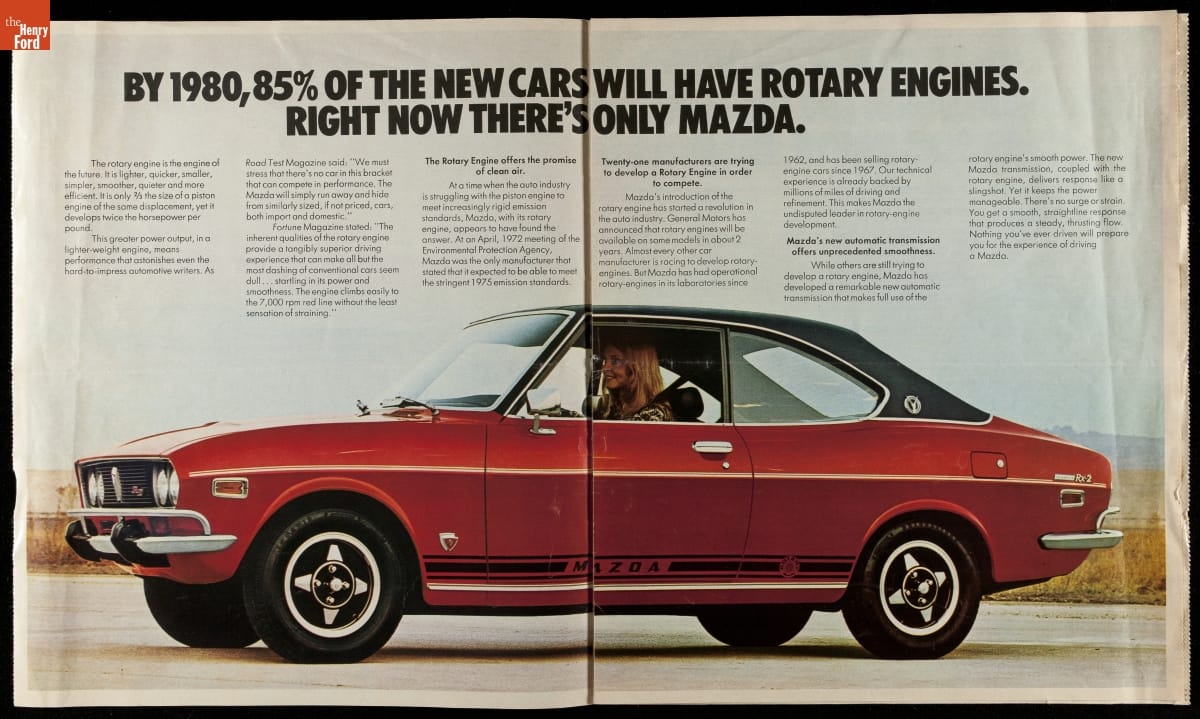 Mazda introduced its first production rotary engine, based on a design by German engineer Felix Wankel, in Japan in 1967. Instead of conventional reciprocating pistons, the rotary powerplant used an eccentric rotor to convert internal combustion power into motion. Mazda brought its rotary engine to the American market for 1974. Though compact and lightweight, rotary engines tended to be less fuel efficient.