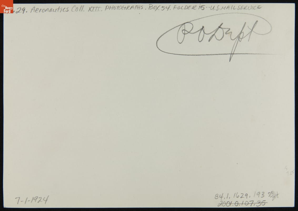 Omaha. July 1, 1924- All photos made by use of field flood lights / Loading plane for the west - E. M. Ellison - pilot