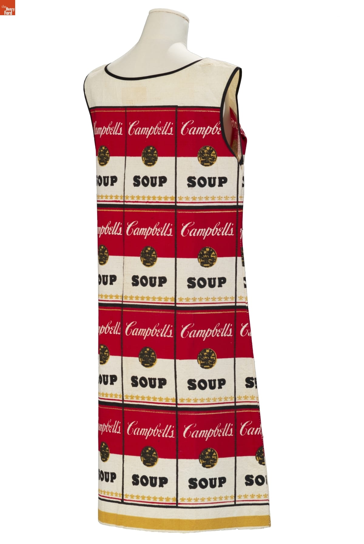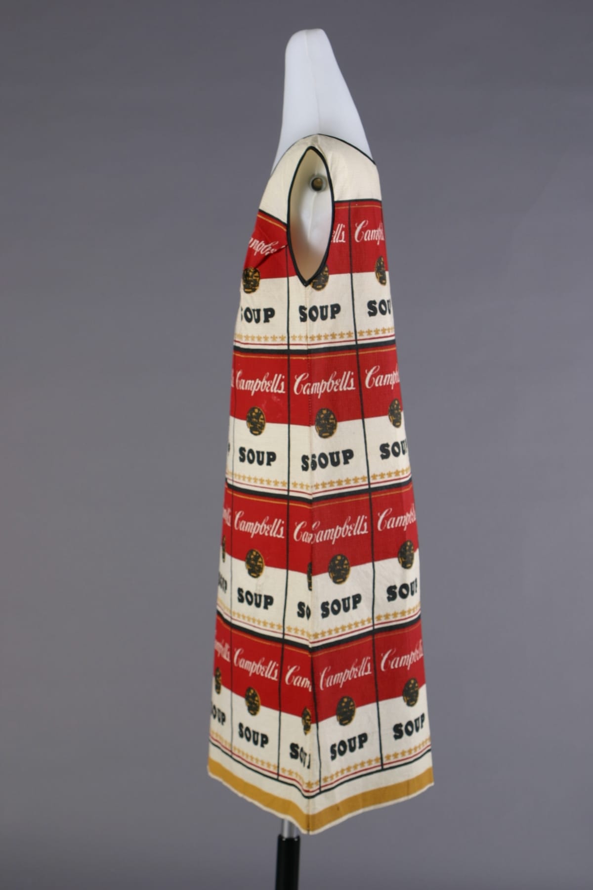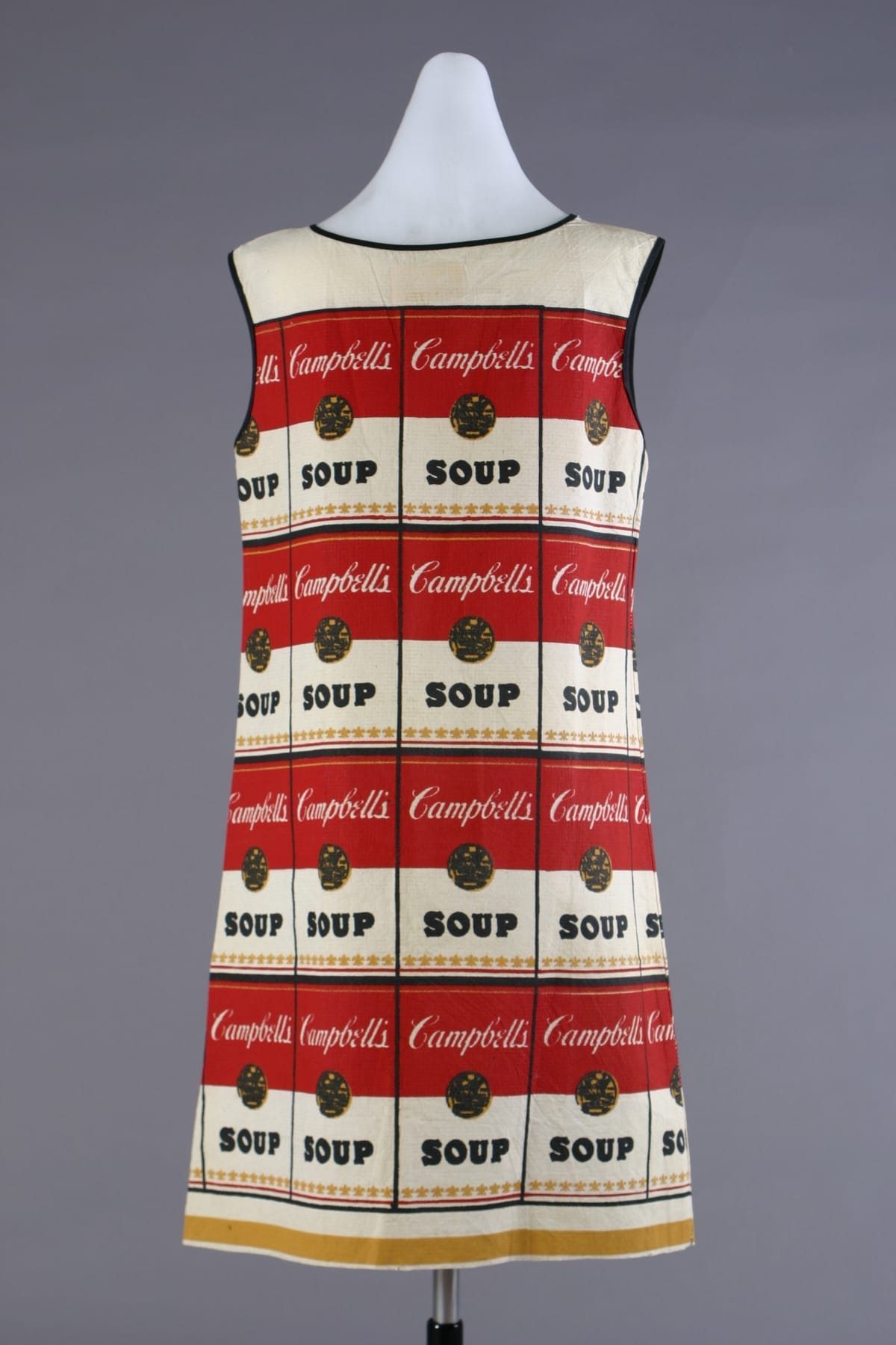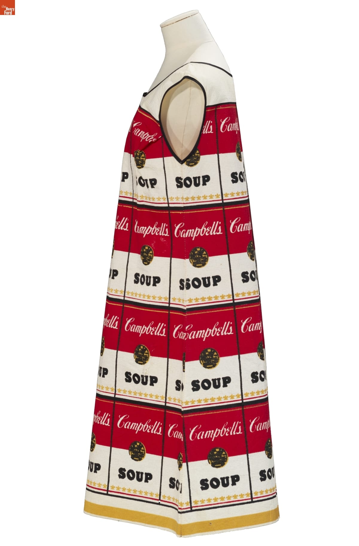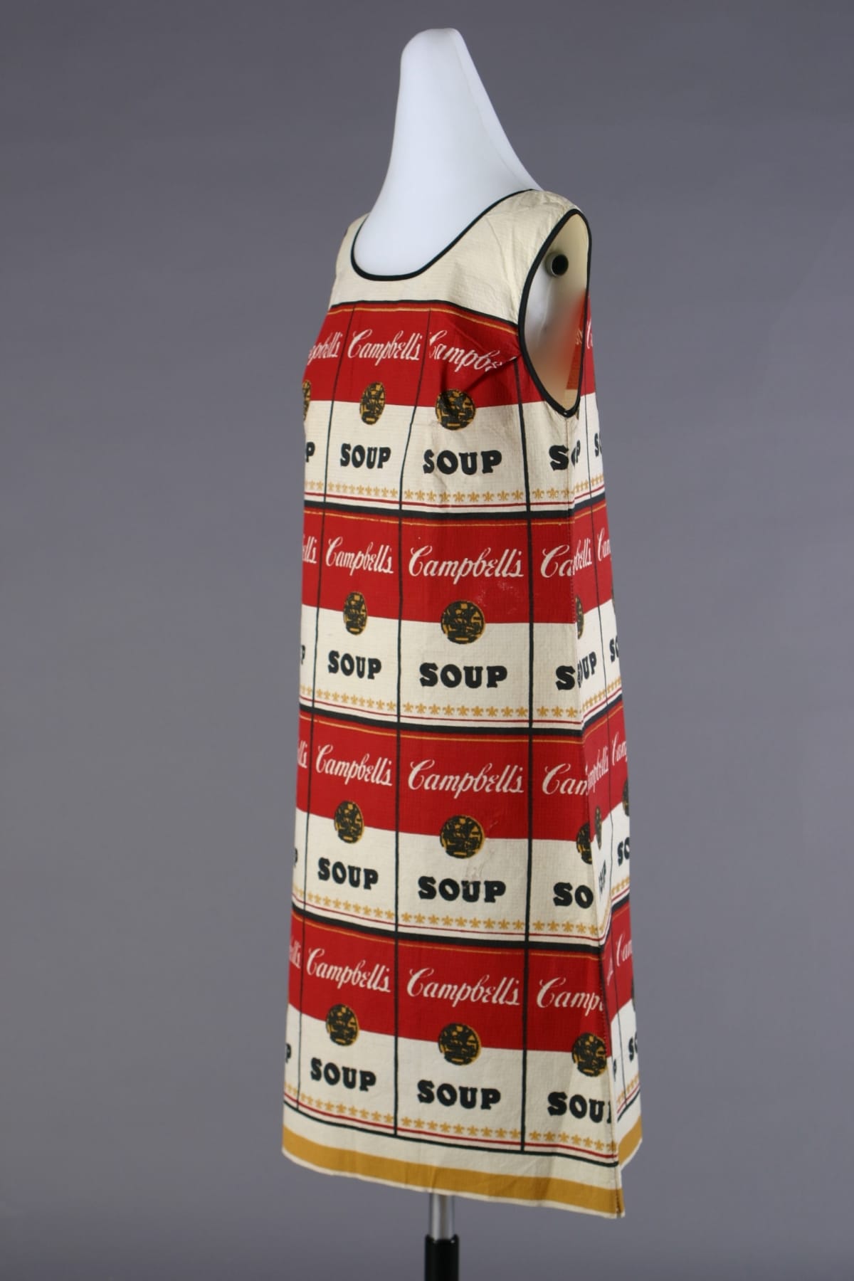 This playful paper dress was inspired by the work of pop artist Andy Warhol, who began using the Campbell soup can image in his artwork during the early 1960s. Produced by the Campbell Soup Company in 1966-67, these "Souper" dresses served as creative advertising for the company during the late 1960s--a time when disposable paper dresses were a popular fad.