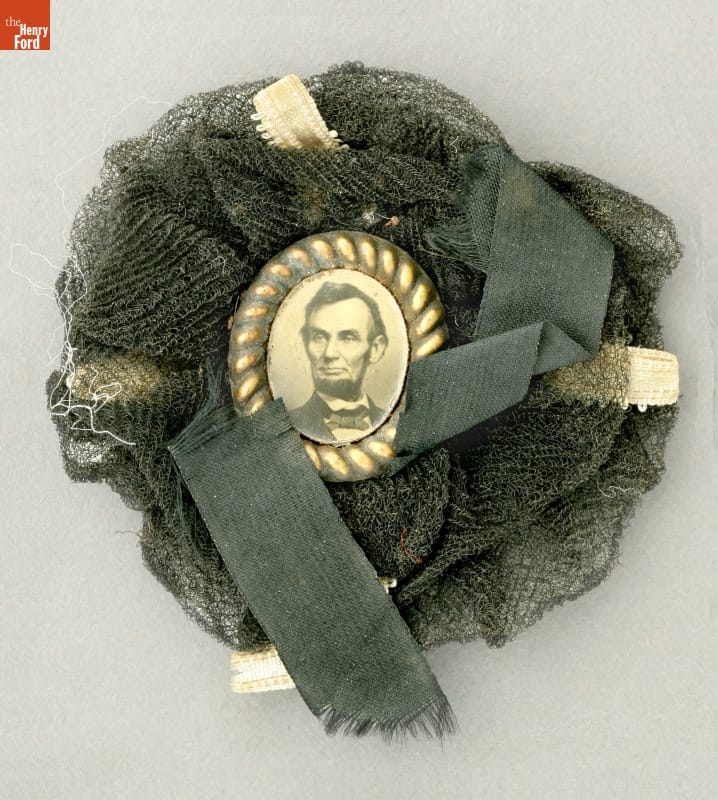 This mourning badge was handmade from a small oval tintype portrait of President Abraham Lincoln. Set into a rope-twist brass frame, it is surrounded by a black crepe rosette and black and white ribbons. This would have been worn on clothing during the spring of 1865 by the many American citizens who felt a strong bond with the martyred President.